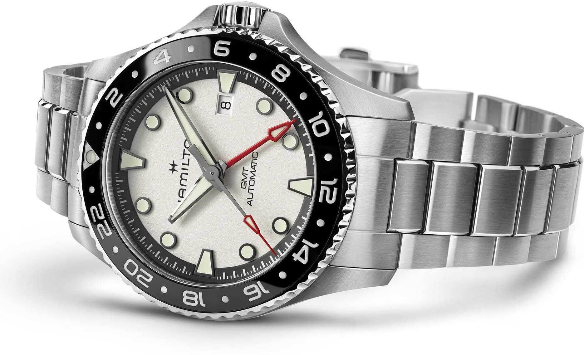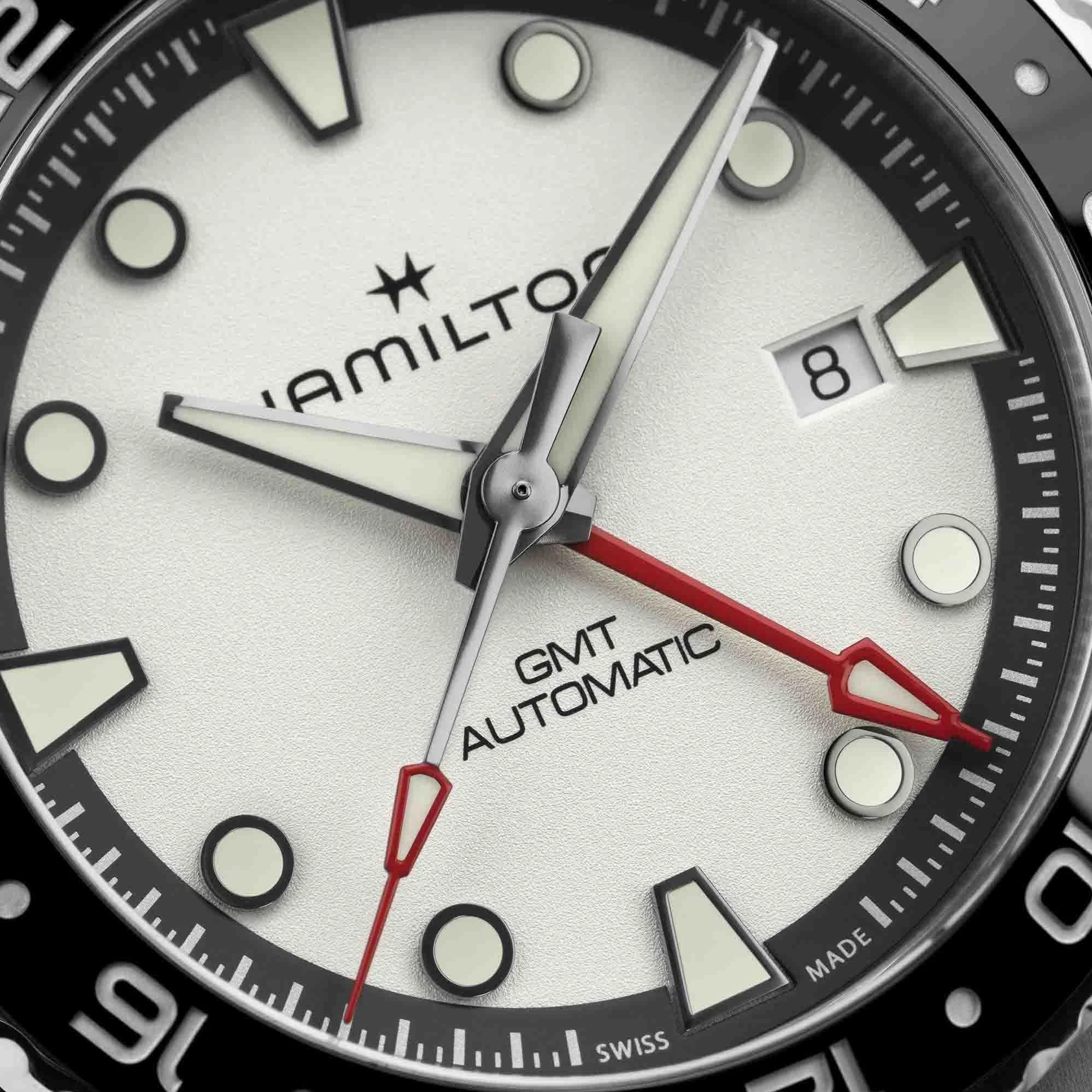 Швейцарские механические наручные мужские часы Hamilton Khaki Navy Scuba Automatic GMT 43мм H82555150 на браслете из нержавеющей стали станут лучшим спутником для путешествий к морю.