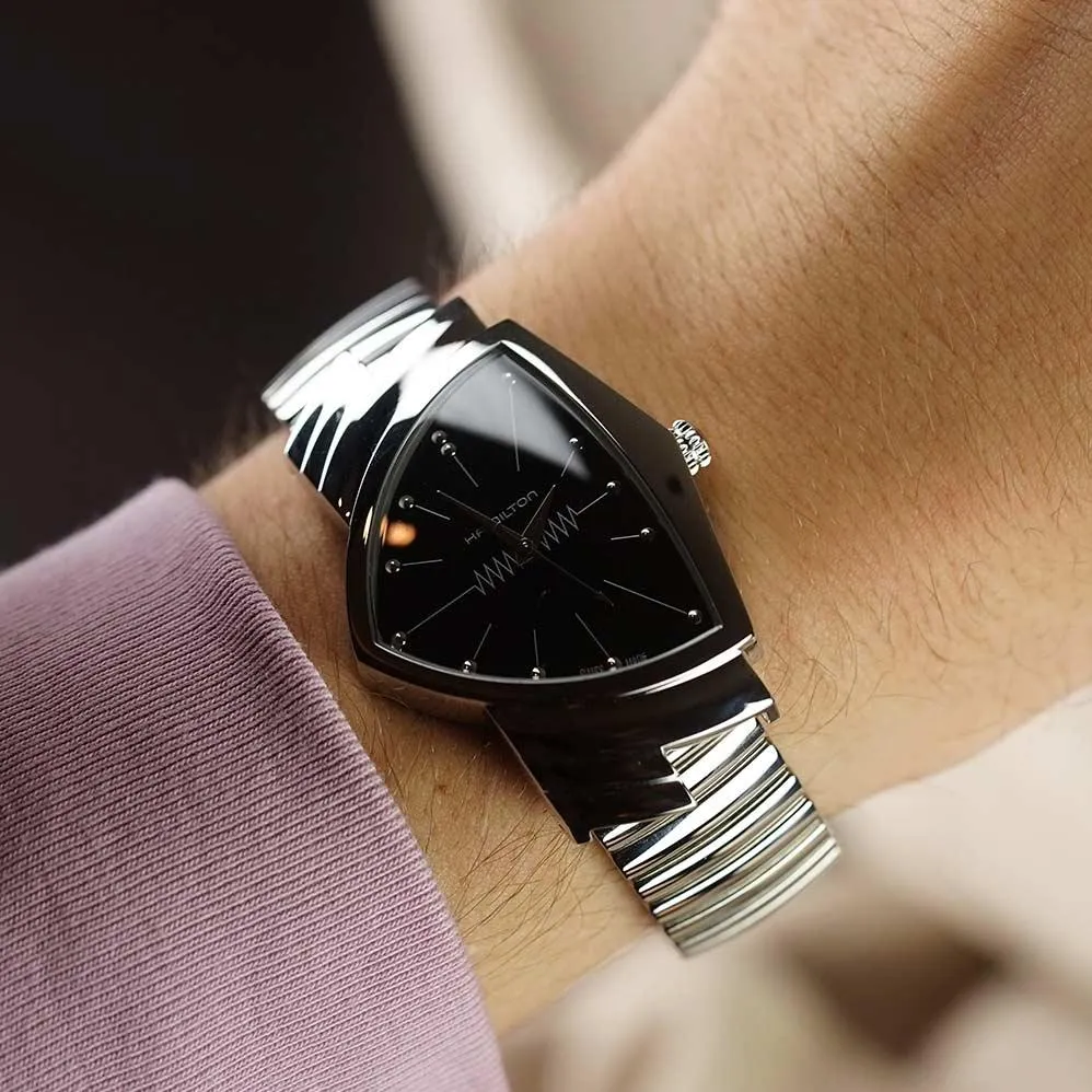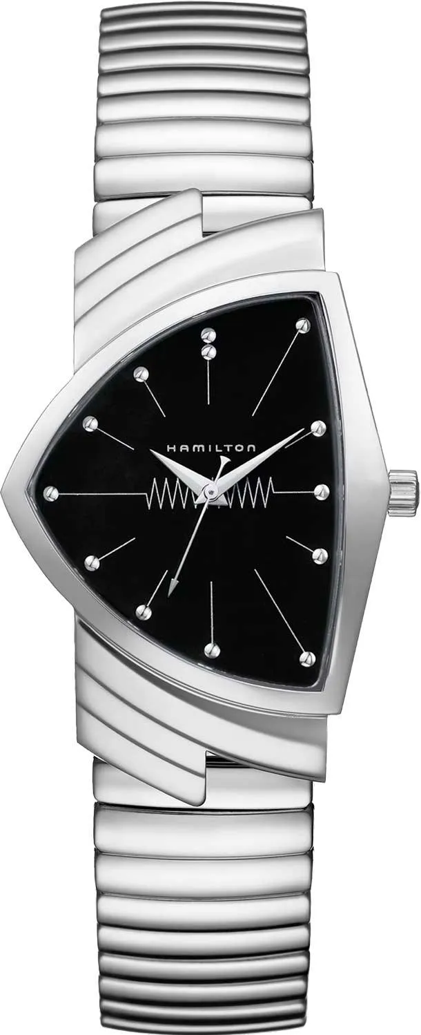 Hamilton Мужские швейцарские часы Ventura H24411232. Точный кварцевый механизм с аналоговой индикацией. В отличие от механических часов, не требуют завода и работают от батареи, показывая отклонение всего несколько секунд в месяц. Браслет из нержавеющей стали обладает высокой прочностью и износостойкостью, обеспечивая долговечность даже при активной эксплуатации. Материал устойчив к коррозии и сохраняет свой внешний вид надолго. Корпус изготовлен из высококачественной нержавеющей стали 316L с высокими антикоррозийными свойствами. Прочное, устойчивое к царапинам минеральное стекло защищает часы от повреждений. Часы являются водонепроницаемыми до 5 Бар. Цвет корпуса: Серебристый. Цвет циферблата: Черный. Толщина: 9.27 мм. Гарантия: 2 года.