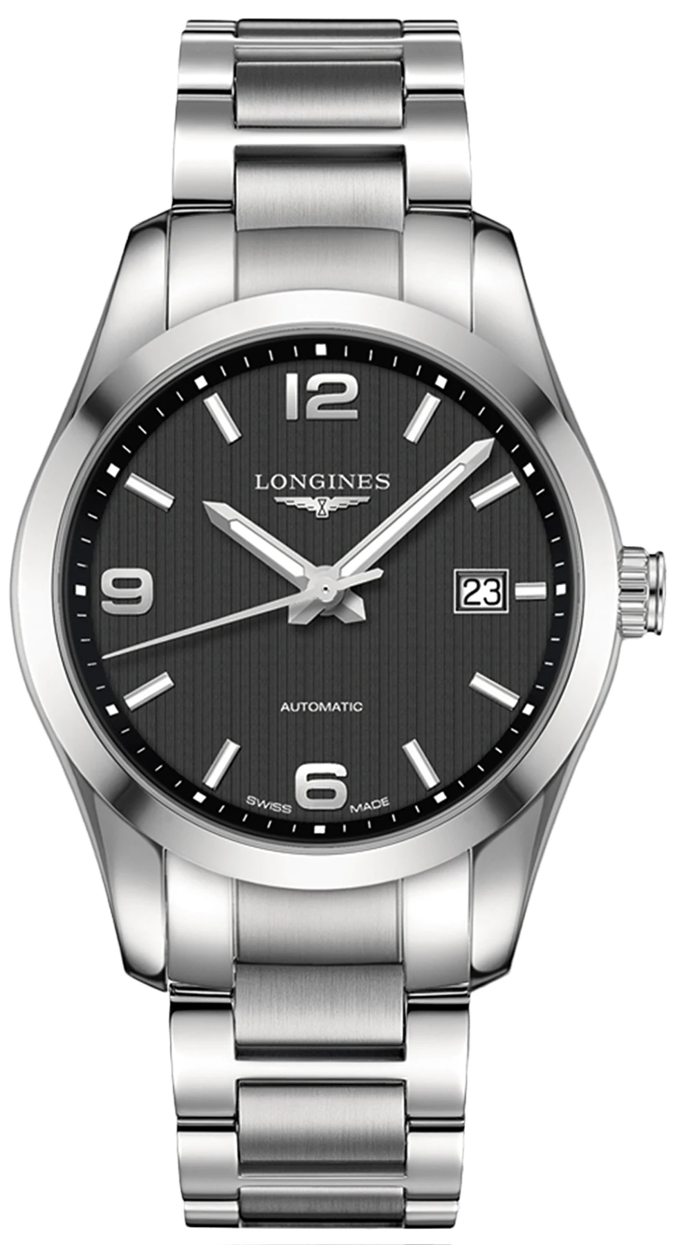 Мужские наручные часы Longines Conquest Classic L2.785.4.56.6. Механические с автоподзаводом. Пружина механизма заводится автоматически благодаря естественным движениям владельца в процессе ежедневной носки часов. Корпус изготовлен из высококачественной нержавеющей стали 316L с высокими антикоррозийными свойствами. На стрелки и отметки нанесен светонакопительный состав, благодаря этому считывать информацию с циферблата возможно и в темноте. На циферблате отображается текущее число месяца. Браслет из нержавеющей стали. Сапфировое стекло. Искусственно изготовленное стекло с высокой прочностью и устойчивостью к царапинам. Часы являются водонепроницаемыми до 5 Бар. Цвет циферблата: Черный. Ширина (с заводной головкой): 40мм. Толщина: 11мм. Гарантия: 2 года.