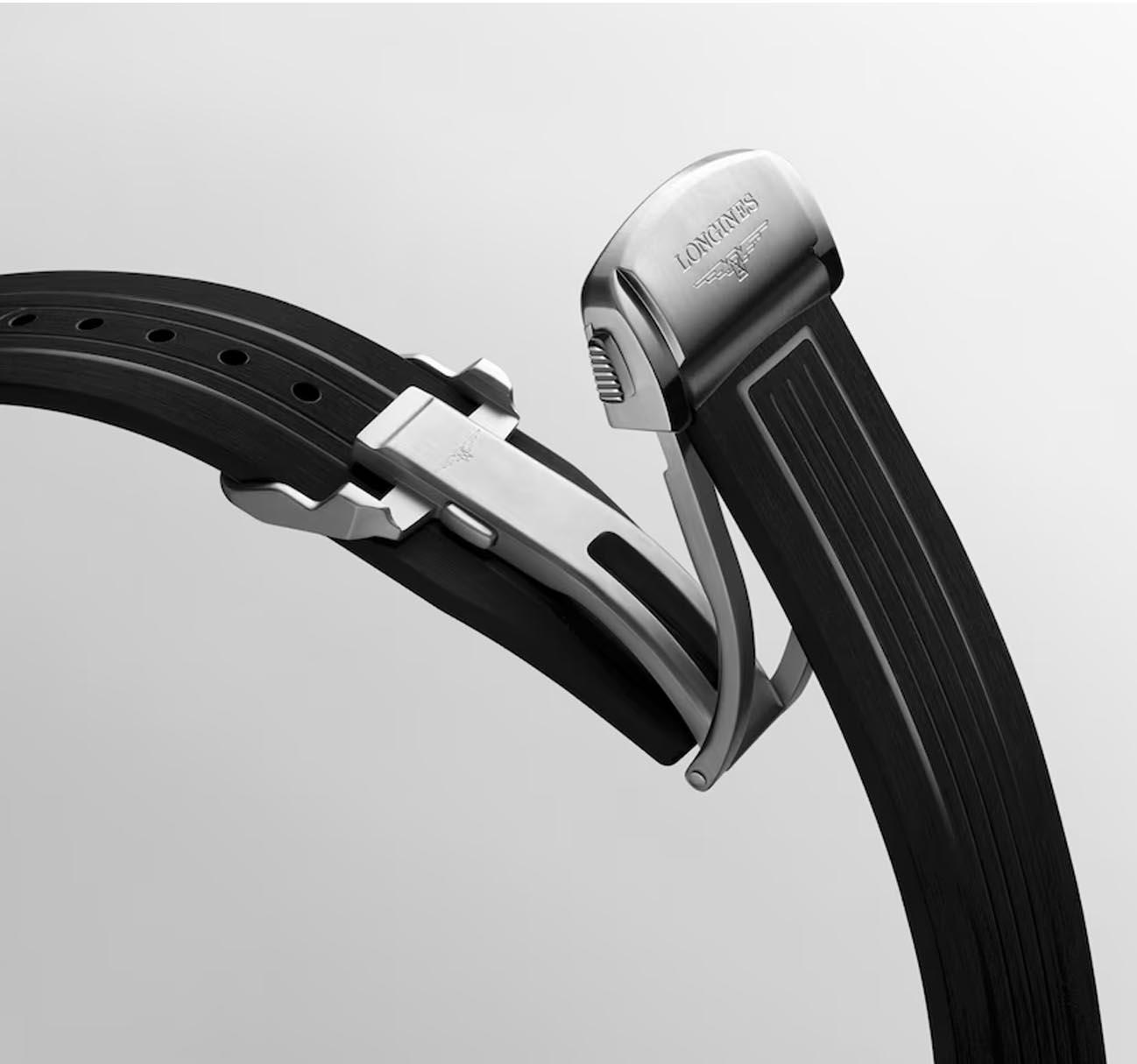 Циферблат глубокого черного цвета с шлифовкой в стиле “sunray”. Фотолюминесцентный состав Swiss Super-LumiNova на стрелках и цифрах, светящийся в темноте. Каучуковый ремешок черного цвета с тиснением в виде продольных линий, ширина ремешка 22 мм. Раскладывающаяся браслетная застежка с системой микроудлинения.