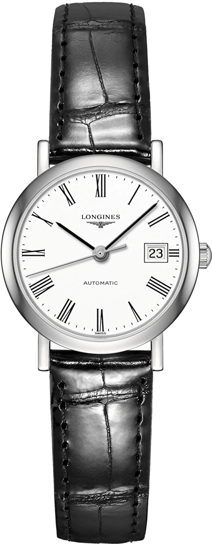 Изящные и утонченные часы Longines L4.309.4.11.2 являются частью коллекции Elegant Collection, которая сочетает классическую эстетику с надежной механикой. Это идеальный аксессуар для женщин, предпочитающих традиционный стиль и комфорт. Круглый корпус диаметром 25,5 мм выполнен из полированной нержавеющей стали. Классический белый циферблат украшен четкими римскими цифрами и отображает только часы, минуты и секунды, сохраняя строгую элегантность. Часы оснащены автоматическим механизмом Longines Calibre L592.2, который виден через прозрачную заднюю крышку корпуса. Дополняет образ черный ремешок из кожи аллигатора с классической стальной застежкой-пряжкой.