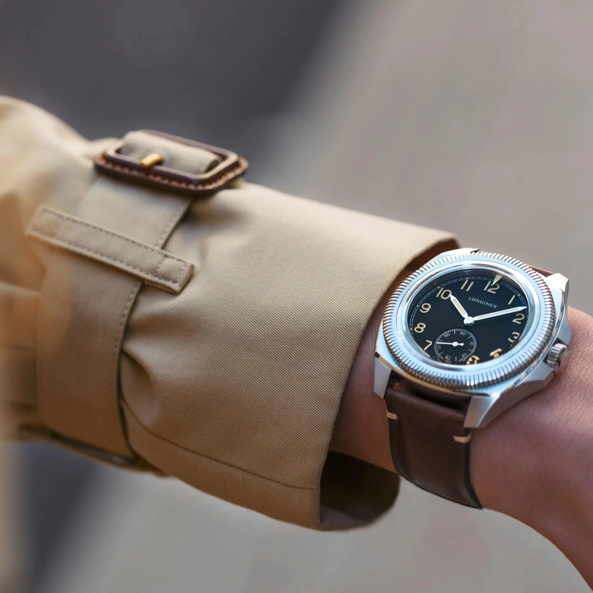 Швейцарские механические часы Longines Pilot Majetek Box Edition L2.838.4.53.9. Сапфировое стекло, устойчивое к появлению царапин, обладающее высокой прозрачностью. Корпус часов изготовлен из нержавеющей стали. Автоматический механизм с частотой баланса 25 200 полуколебаний в час и запасом хода, которого хватает примерно на 72 часа работы. Часы, минуты, малая секундная стрелка в положении 6 часов. Водонепроницаемость до 10 бар. Черный матовый циферблат, покрытие swiss super-luminova®. Ремешок из кожи аллигатора на стандартной застежке.