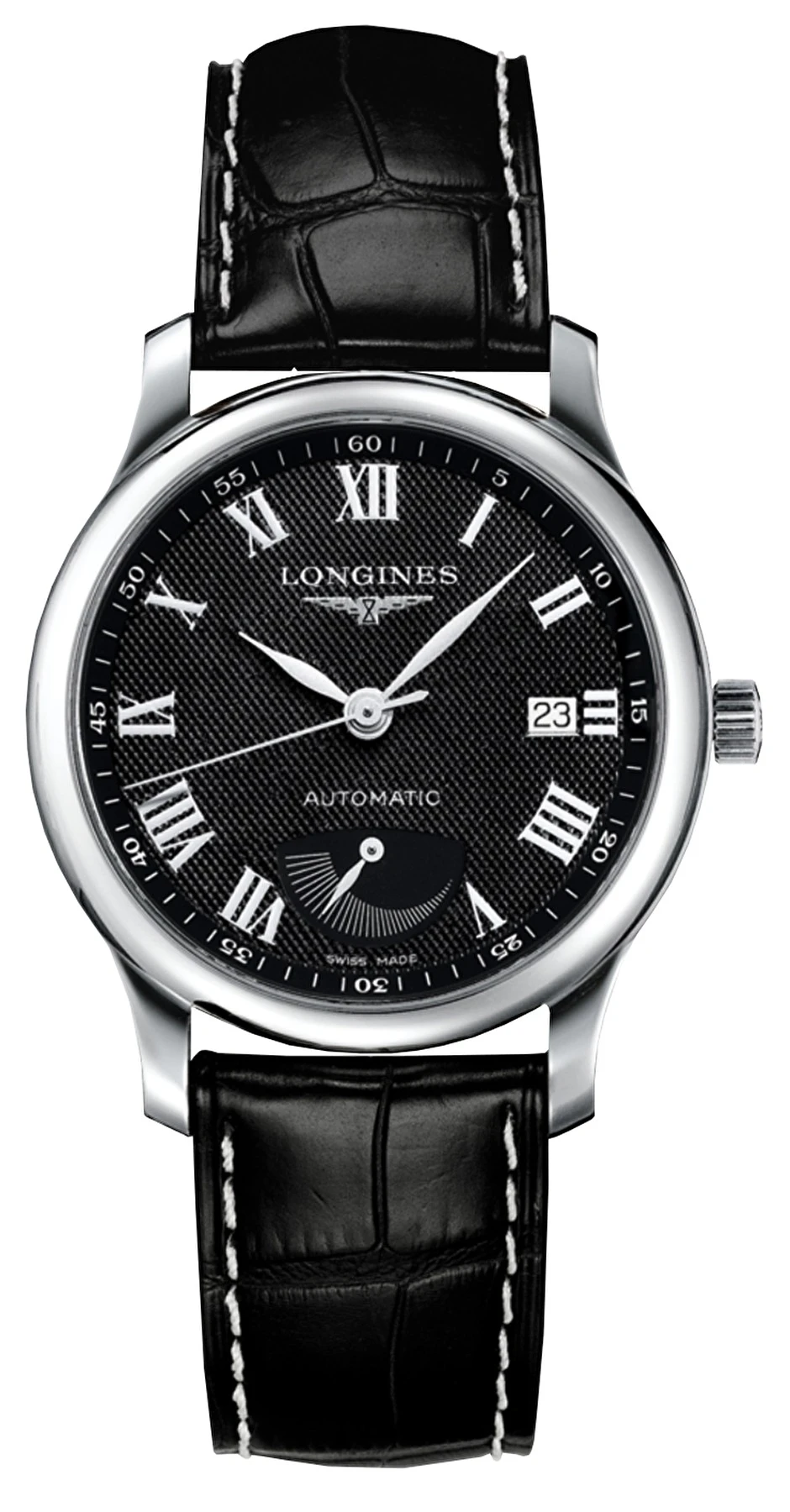 Серебристый корпус диаметром 38,5 мм из нержавеющей стали с чёрным кожаным ремешком. Фиксированный серебристый безель из нержавеющей стали. Черный циферблат с серебристыми стрелками и римскими цифрами. Минутные метки по внешнему ободу. Тип циферблата: аналоговый. Указатель даты в положении «3 часа». Один дополнительный циферблат с индикатором запаса хода. Механизм Longines Calibre L602 с автоматическим подзаводом и запасом хода 42 часа. Сапфировое стекло, устойчивое к царапинам. Прозрачная задняя крышка. Круглая форма корпуса. Размер корпуса: 38,5 мм. Ширина ремешка: 20 мм. Раскладная кнопочная застёжка. Водонепроницаемость до 30 метров / 100 футов. Функции: дата, часы, минуты, секунды, индикатор запаса хода.