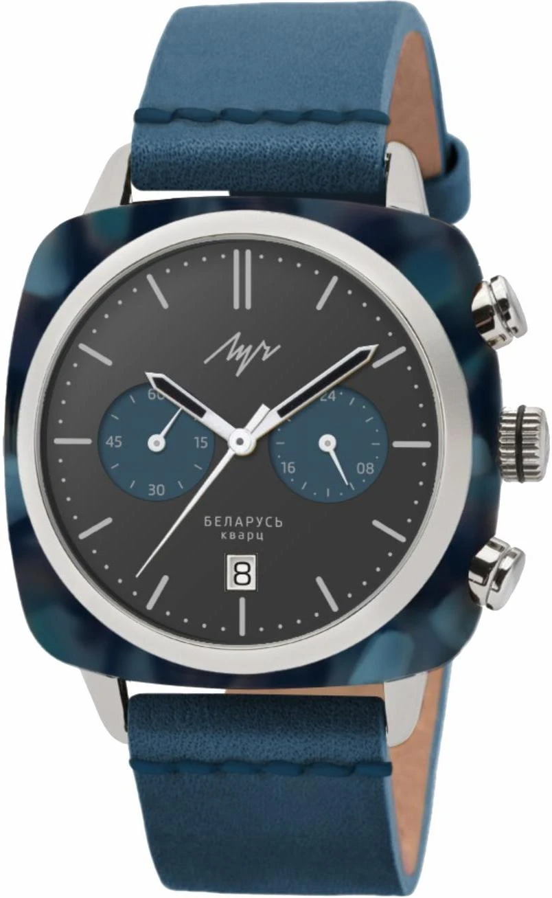 Мужские наручные часы Luch 80`S 740257588. Точный кварцевый механизм с аналоговой индикацией. Ремешок изготовлен из кожи. Функция хронографа. Отображение времени возможно в 12-часовом или 24-часовом формате. Браслет из нержавеющей стали. Прочное, устойчивое к царапинам минеральное стекло защищает часы от повреждений. На циферблате отображается текущее число месяца. Часы являются водонепроницаемыми до 3 Бар. Цвет циферблата: Серебристый. Цвет циферблата: Синий. Цвет корпуса: Черный. На стрелки и отметки нанесен светонакопительный состав, благодаря этому считывать информацию с циферблата возможно и в темноте. Толщина: 13 мм. Гарантия: 2 года.