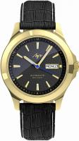 Мужские наручные часы Luch ЭГО 437808332. Механические с ручным подзаводом. Ремешок изготовлен из кожи. Браслет из нержавеющей стали. Сапфировое стекло. Искусственно изготовленное стекло с высокой прочностью и устойчивостью к царапинам. На циферблате отображается текущее число месяца и день недели. Часы являются водонепроницаемыми до 5 Бар. Цвет циферблата: Желтое золото. Цвет корпуса: Черный. На стрелки и отметки нанесен светонакопительный состав, благодаря этому считывать информацию с циферблата возможно и в темноте. Высота (с ушками): 50 мм. Толщина: 10 мм. Гарантия: 2 года.