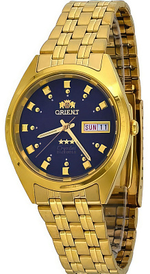 <b>Часы для мужчин с классическим спортивным дизайном из знаменитой коллекции 3 Stars. Корпус круглой формы из нерж. стали с покрытием на стальном браслете. Прочное минеральное стекло. Надежный автоматический механизм с датой и днем недели.</b><br><br>Автоматический механизм ORIENT (21 рубиновый камень, частота полуколебаний баланса 21600 полуоб/час. Автоподзавод. Противоударное устройство оси баланса.). Центральная секундная стрелка. Окошко даты и дня недели. • Запас хода более 40 часов. • Точность хода не хуже -15...+25 сек./в сутки. • Минеральное стекло устойчивое к возникновению царапин. • Корус - сталь с золотым покрытием. Толщина покрытия 5 микрон (метод гальванического нанесения). • Водозащита до 3 АТМ. • Браслет из нержавеющей стали. • Надежный браслетный замок с тройным сгибом.