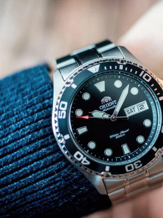 • Поворотный безель с лаковым покрытием вращается щелчками против хода стрелок.