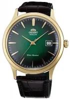 Наручные часы с автоподзаводом и окошком даты в стальном круглом корпусе с покрытием цвета золота. Циферблат зеленого цвета. Минеральное стекло. На коричневом кожаном ремешке.