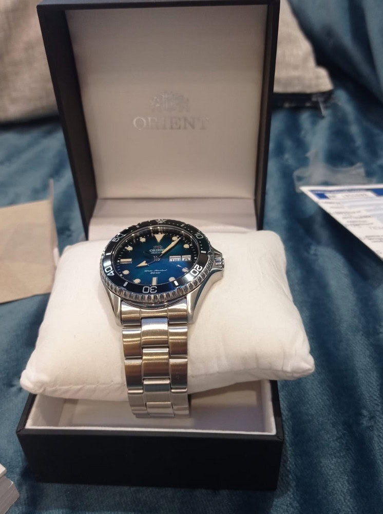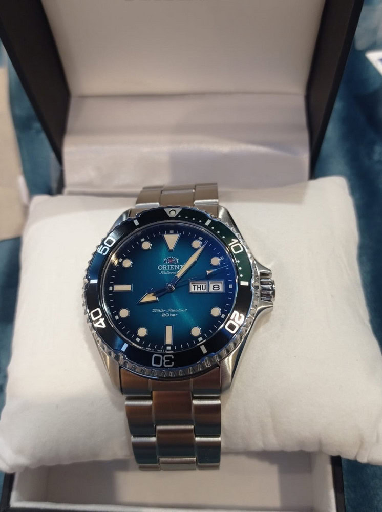 Мужские наручные часы Orient Automatic RA-AA0818L. Механические с ручным подзаводом. Браслет из нержавеющей стали. Браслет из нержавеющей стали. Сапфировое стекло. Искусственно изготовленное стекло с высокой прочностью и устойчивостью к царапинам. На циферблате отображается текущее число месяца и день недели. Часы являются водонепроницаемыми до 20 Бар. Цвет циферблата: Серебристый. Цвет циферблата: Синий. Цвет корпуса: Синий. На стрелки и отметки нанесен светонакопительный состав, благодаря этому считывать информацию с циферблата возможно и в темноте. Толщина: 13 мм. Гарантия: 2 года.