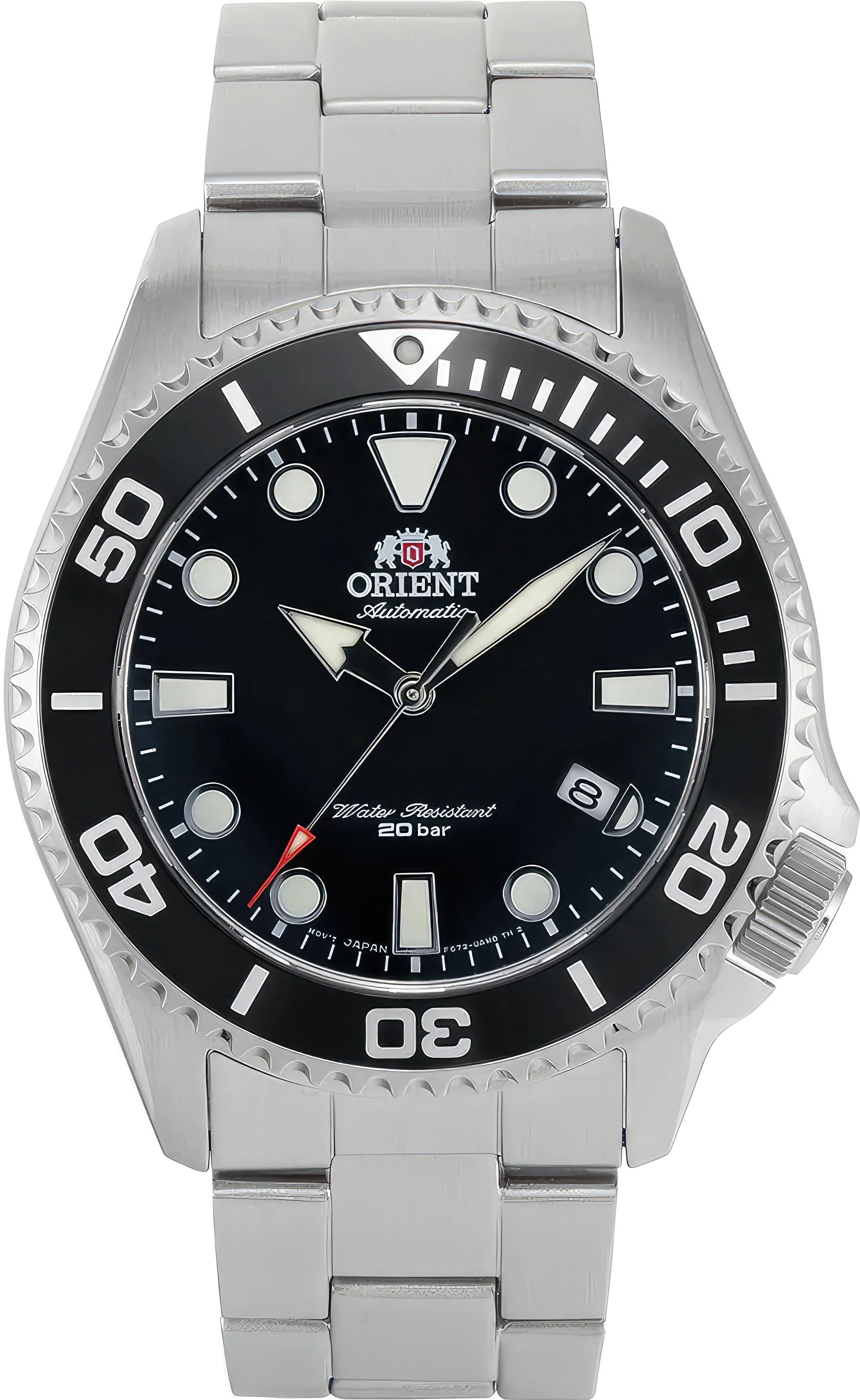 Автоматический механизм ORIENT F67(AC) (22 рубиновых камня, частота полуколебаний баланса 21600 полуоб/час. Автоподзавод. Возможность ручного завода. Противоударное устройство оси баланса.). Центральная секундная стрелка. Окошко даты. • Запас хода более 40 часов. • Точность хода не хуже -15...+25 сек./в сутки. • Функция стоп-секунда (остановка секундной стрелки для установки точного времени) • Сапфировое стекло устойчивое к царапанию. • Светонакопительный состав на стрелках и маркерах часа. • Корпус из высококачественного стального сплава 316L с высокими антикоррозийными свойствами. • Однонаправленный поворотный безель. • Завинчивающаяся заводная головка. • Водозащита до 20 АТМ. • Литой браслет из нержавеющей стали. • Надежный браслетный замок с тройным сгибом.