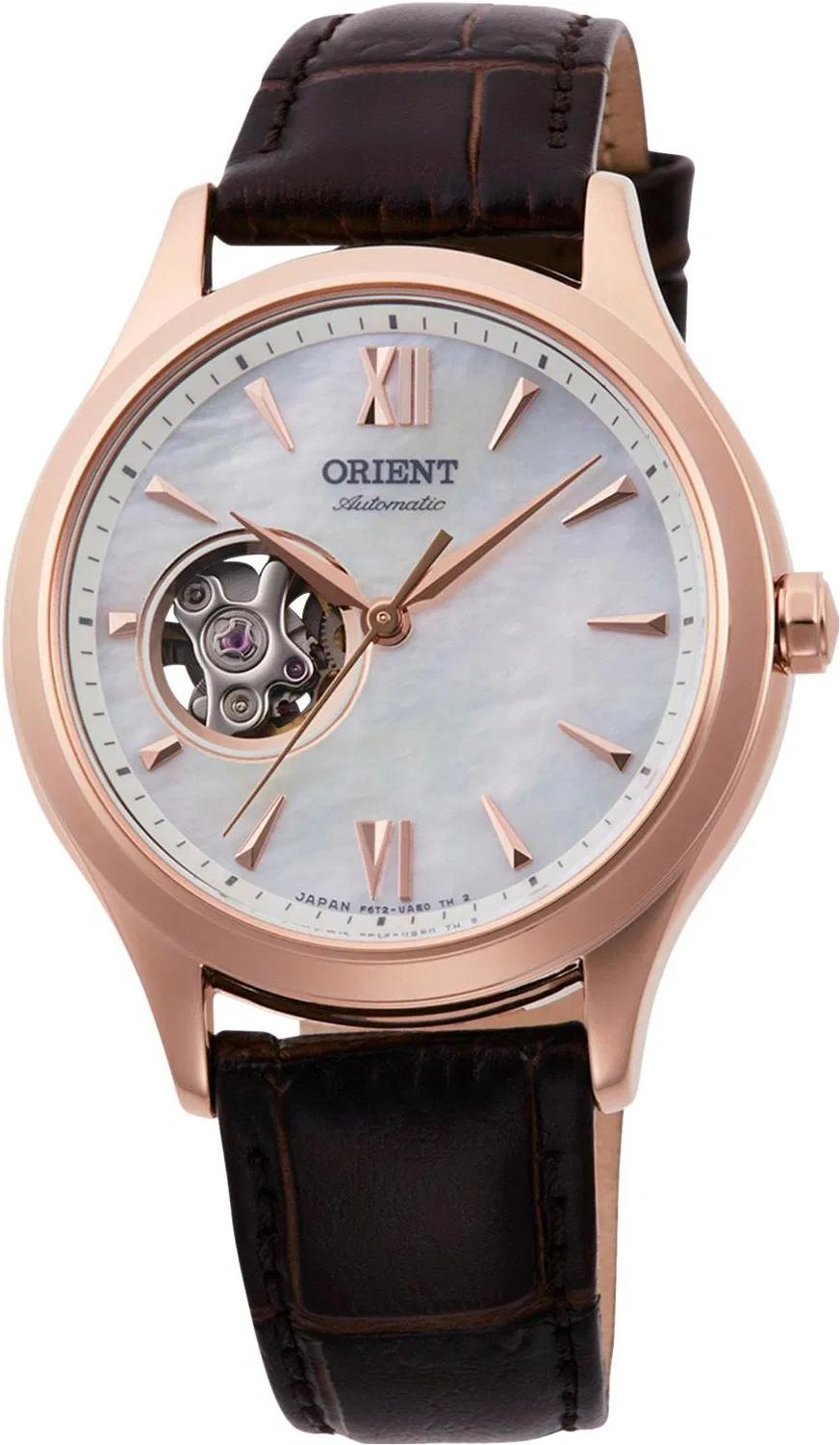 <b>Женские механические часы с автоподзаводом из серии Stela. Круглый стальной корпус со смотровым окошком с PVD покрытием цвета розового золота. Перламутровый циферблат. Минеральное стекло. Кожаный коричневый ремешок. Простая пряжка. Водозащита 30 м.</b><br><br>Японский автоматический механизм ORIENT F6T(AG) (22 рубиновых камня, частота полуколебаний баланса 21600 полуоб/час. Автоподзавод. Возможность ручного завода. Противоударное устройство оси баланса.). Центральная секундная стрелка. • Запас хода более 40 часов. • Точность хода не хуже -15...+25 сек./в сутки. • Функция стоп-секунда (остановка секундной стрелки для установки точного времени). • Корпус из нержавеющей стали со стойким PVD покрытием цвета розового золота. • Сквозь апертуру циферблата видна работа анкерного механизма и колебания баланса. • Задняя крышка со смотровым окном. • Перламутровый циферблат. • Водозащита до 3 АТМ. • Ремешок из натуральной кожи коричневого цвета. • Ширина ремешка 17 мм. • Простая ремешковая застежка.