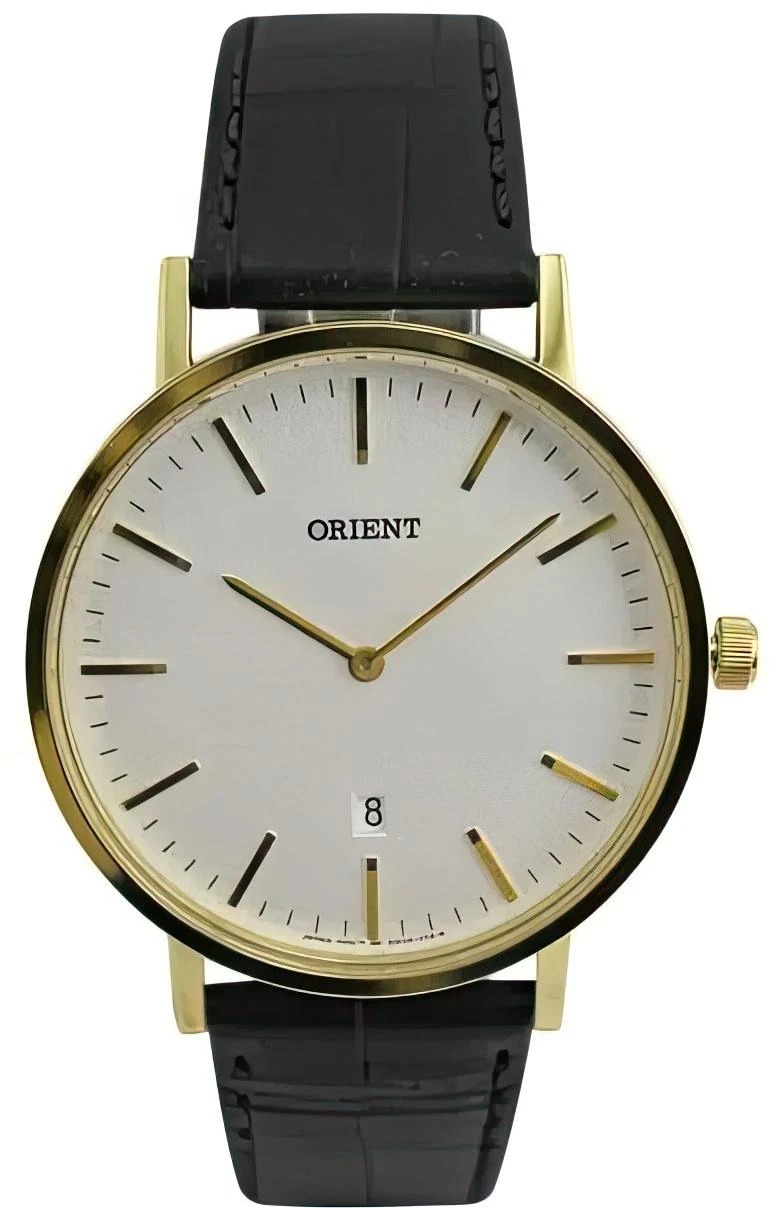 Наручные часы с окошком даты, в круглом позолоченном корпусе, на кожаном ремешке.