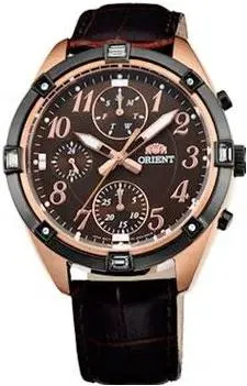 Женские наручные часы с позолотой корпуса, украшенного кристаллами. Индикаторы даты, дня недели и 24-часовой формат времени. Минеральное стекло. Коричневый кожаный ремешок.