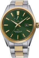 Мужские механические часы с автоподзаводом из серии Orient Star. Круглый стальной корпус с частичным PVD покрытием цвета золота. Зеленый циферблат. Сапфировое стекло. Водозащита 50 м. Стальной браслет с частичным покрытием. Раскладывающаяся застежка.