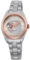 Женские механические часы с автоподзаводом из серии Orient Star. Круглый стальной корпус с частичным PVD покрытием цвета розового золота. Серебристый циферблат украшен бриллиантом. Сапфировое стекло. Водозащита 50м. Стальной браслет. Браслетный замок
