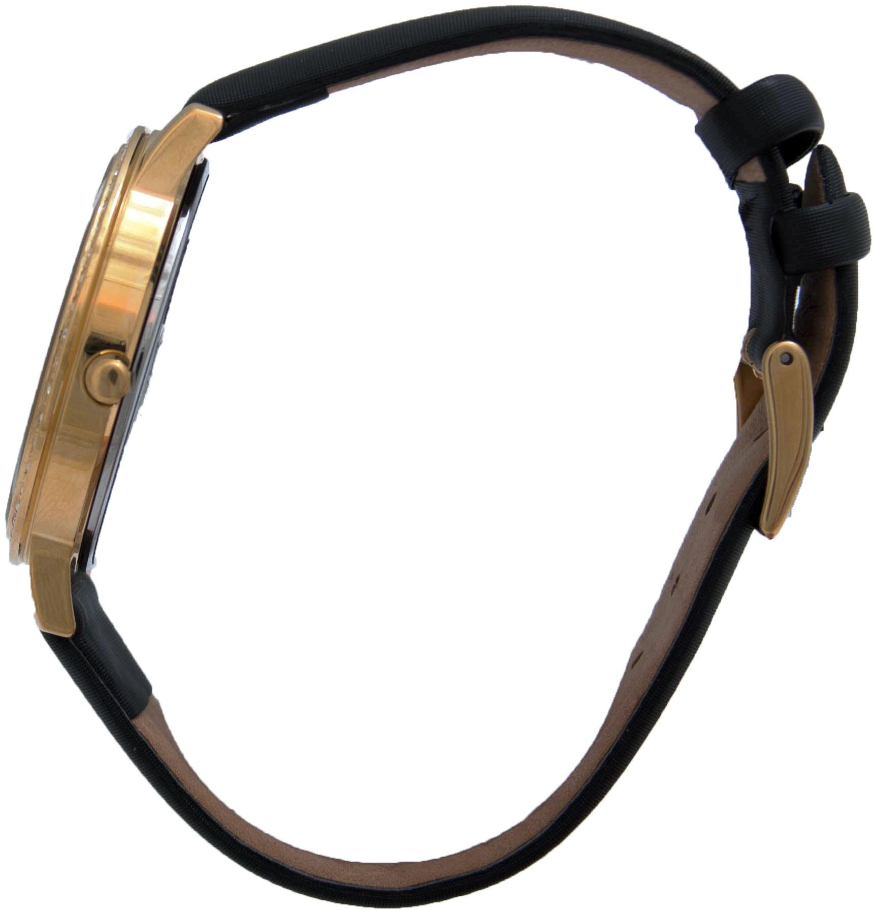 Женские наручные часы в стальном позолоченном корпусе украшенном цирконами на кожаном ремешке. Циферблат со стрелочными указателями даты, дня недели и 12/24 часовая шкала.