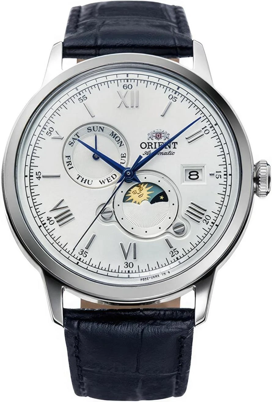 Мужские наручные часы Orient Sun & Moon Classic RA-AK0802S. Механические с автоподзаводом. Пружина механизма заводится автоматически благодаря естественным движениям владельца в процессе ежедневной носки часов. Корпус изготовлен из высококачественной нержавеющей стали 316L с высокими антикоррозийными свойствами. На циферблате отображается текущее число месяца и день недели. Ремешок изготовлен из кожи. Сапфировое стекло. Искусственно изготовленное стекло с высокой прочностью и устойчивостью к царапинам. Часы являются водонепроницаемыми до 3 Бар. Цвет корпуса: Серебристый. Цвет циферблата: Белый. Ширина (с заводной головкой): 42мм. Толщина: 10мм. Гарантия: 2 года. Другие наименования модели: RA-AK0802S10B.