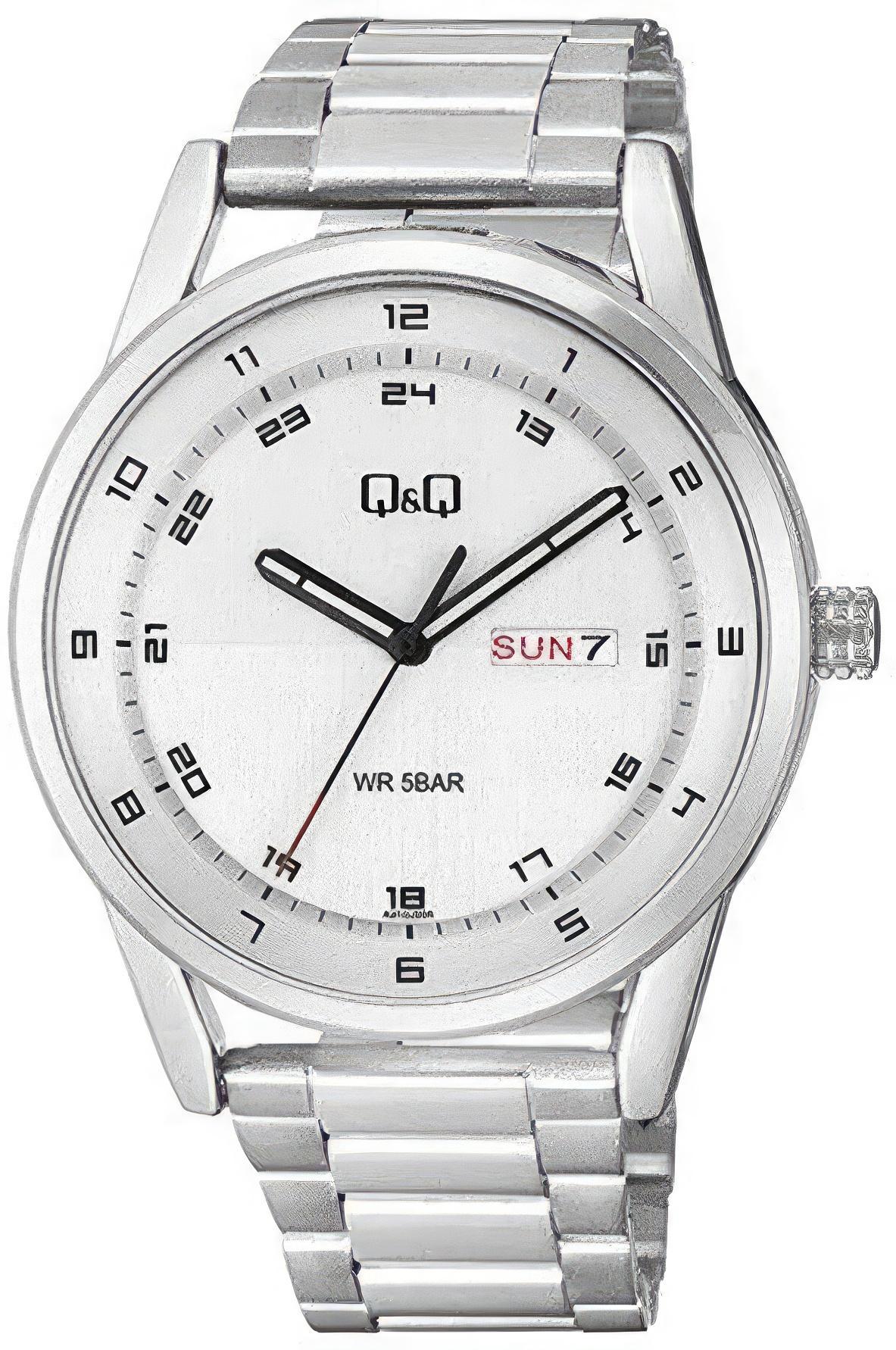 Мужские наручные часы Q&Q Attractive A210J204Y. Точный кварцевый механизм с аналоговой индикацией. Корпус изготовлен из высококачественной часовой латуни с высокими антикоррозийными свойствами. На стрелки и отметки нанесен светонакопительный состав, благодаря этому считывать информацию с циферблата возможно и в темноте. На циферблате отображается текущее число месяца и день недели. Браслет из нержавеющей стали. Прочное, устойчивое к царапинам минеральное стекло защищает часы от повреждений.Часы являются водонепроницаемыми до 5 Бар. Цвет корпуса: Серебристый. Цвет циферблата: Белый. Ширина (с заводной головкой): 43мм. Толщина: 11мм. Гарантия: 1 год.