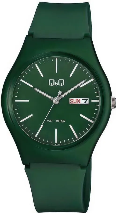 Мужские наручные часы Q&Q Attractive A212J013Y. Точный кварцевый механизм. Полимерный корпус надежно защищает часы от механических повреждений. На стрелки и отметки нанесен светонакопительный состав, благодаря этому считывать информацию с циферблата возможно и в темноте. На циферблате отображается текущее число месяца и день недели. Полимерный ремешок. Натуральный полимерный материал является идеальным для изготовления ремешка благодаря своей чрезвычайной прочности и гибкости. Органическое стекло. Часы являются водонепроницаемыми до 10 Бар. Цвет корпуса: Зеленый. Ширина (с заводной головкой): 38мм. Толщина: 11мм. Гарантия: 1 год.