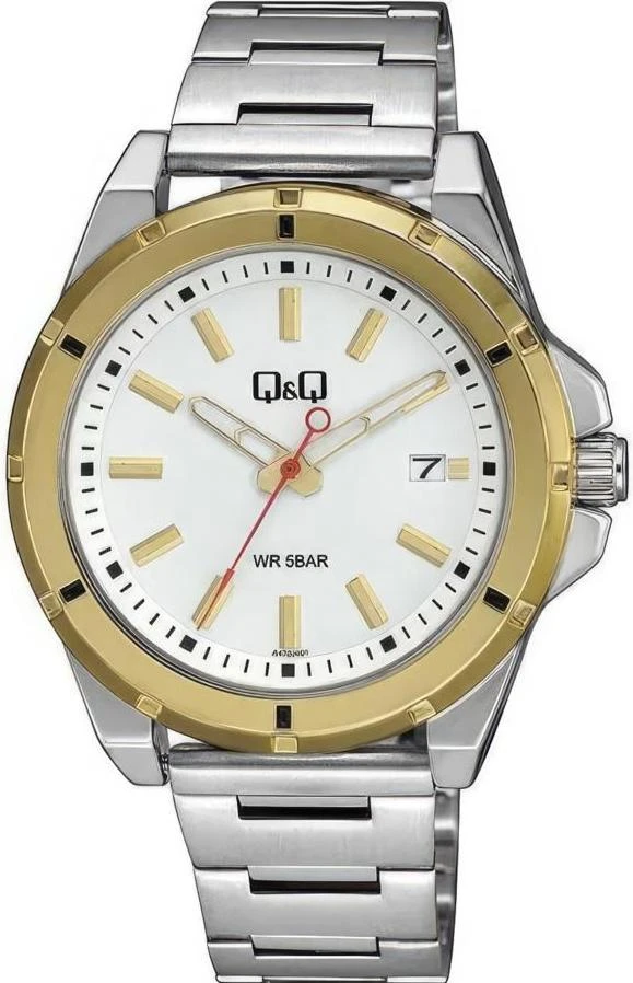 Мужские наручные часы Q&Q Attractive A472J401Y. Точный кварцевый механизм с аналоговой индикацией. Корпус изготовлен из высококачественной часовой латуни с высокими антикоррозийными свойствами. На стрелки и отметки нанесен светонакопительный состав, благодаря этому считывать информацию с циферблата возможно и в темноте. На циферблате отображается текущее число месяца. Браслет из нержавеющей стали. Прочное, устойчивое к царапинам минеральное стекло защищает часы от повреждений.Часы являются водонепроницаемыми до 5 Бар. Цвет циферблата: Белый. Ширина (с заводной головкой): 42мм. Толщина: 11мм. Гарантия: 1 год.