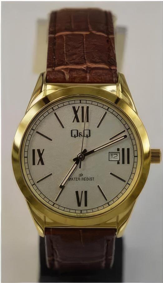 Мужские наручные часы Q&Q Attractive BL67J802Y. Точный кварцевый механизм с аналоговой индикацией. Корпус изготовлен из высококачественной часовой латуни с высокими антикоррозийными свойствами. На стрелки и отметки нанесен светонакопительный состав, благодаря этому считывать информацию с циферблата возможно и в темноте. На циферблате отображается текущее число месяца. Ремешок изготовлен из кожи. Прочное, устойчивое к царапинам минеральное стекло защищает часы от повреждений.Часы являются водонепроницаемыми до 3 Бар. Цвет корпуса: Желтое золото. Цвет циферблата: Серебристый. Ширина (с заводной головкой): 42мм. Толщина: 10мм. Гарантия: 1 год.