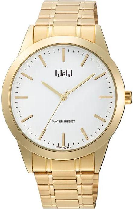 Мужские наручные часы Q&Q Attractive C00AJ009Y. Точный кварцевый механизм с аналоговой индикацией. Браслет из нержавеющей стали. Браслет из нержавеющей стали. Прочное, устойчивое к царапинам минеральное стекло защищает часы от повреждений. Часы являются водонепроницаемыми до 3 Бар. Цвет циферблата: Желтое золото. Цвет корпуса: Белый. Толщина: 8 мм. Гарантия: 1 год.