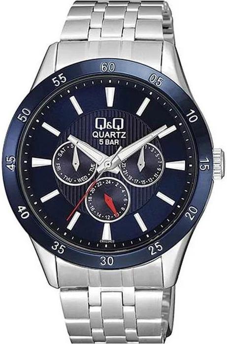 Мужские наручные часы Q&Q Attractive CE02J422Y. Точный кварцевый механизм с аналоговой индикацией. Корпус изготовлен из высококачественной часовой латуни с высокими антикоррозийными свойствами. На стрелки и отметки нанесен светонакопительный состав, благодаря этому считывать информацию с циферблата возможно и в темноте. На циферблате отображается текущее число месяца и день недели. Браслет из нержавеющей стали. Прочное, устойчивое к царапинам минеральное стекло защищает часы от повреждений.Часы являются водонепроницаемыми до 5 Бар. Цвет корпуса: Двухцветный. Цвет циферблата: Синий. Ширина (с заводной головкой): 42мм. Толщина: 10мм. Гарантия: 1 год.