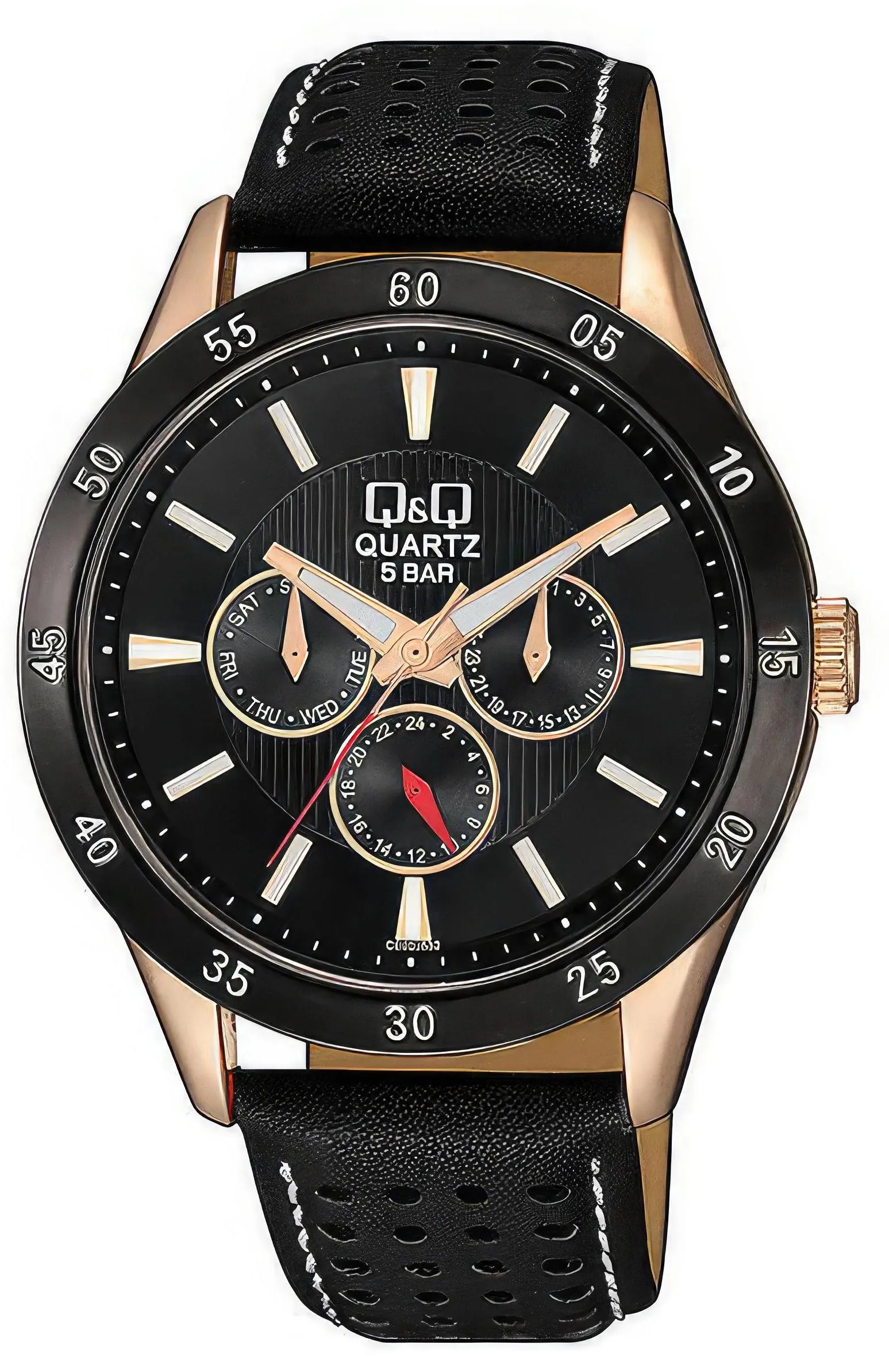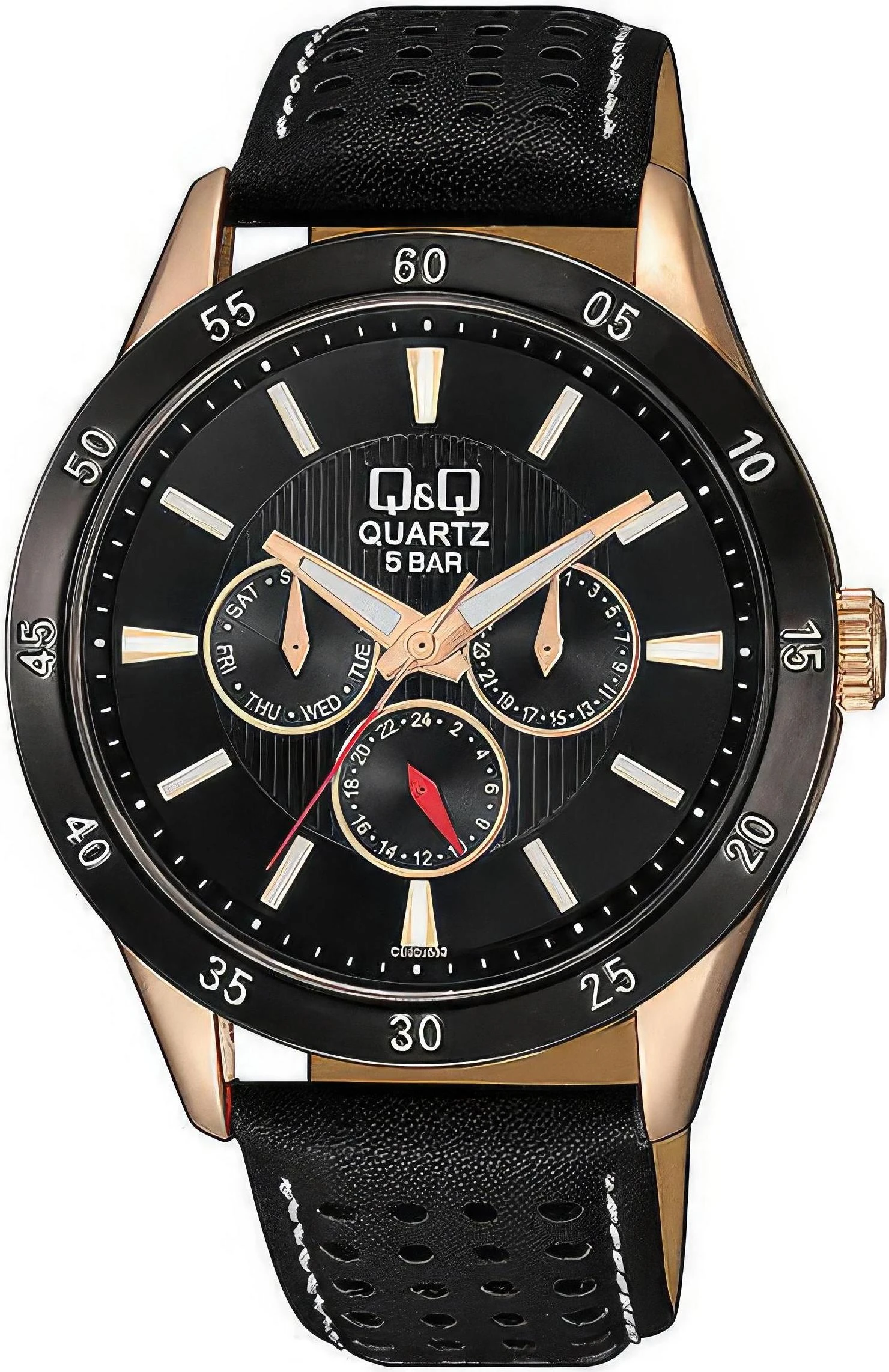 Мужские наручные часы Q&Q Attractive CE02J532Y. Точный кварцевый механизм с аналоговой индикацией. Корпус изготовлен из высококачественной часовой латуни с высокими антикоррозийными свойствами. На стрелки и отметки нанесен светонакопительный состав, благодаря этому считывать информацию с циферблата возможно и в темноте. На циферблате отображается текущее число месяца и день недели. Ремешок изготовлен из кожи. Прочное, устойчивое к царапинам минеральное стекло защищает часы от повреждений.Часы являются водонепроницаемыми до 5 Бар. Цвет корпуса: Черный. Цвет циферблата: Черный. Ширина (с заводной головкой): 44мм. Толщина: 10мм. Гарантия: 1 год.