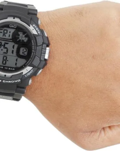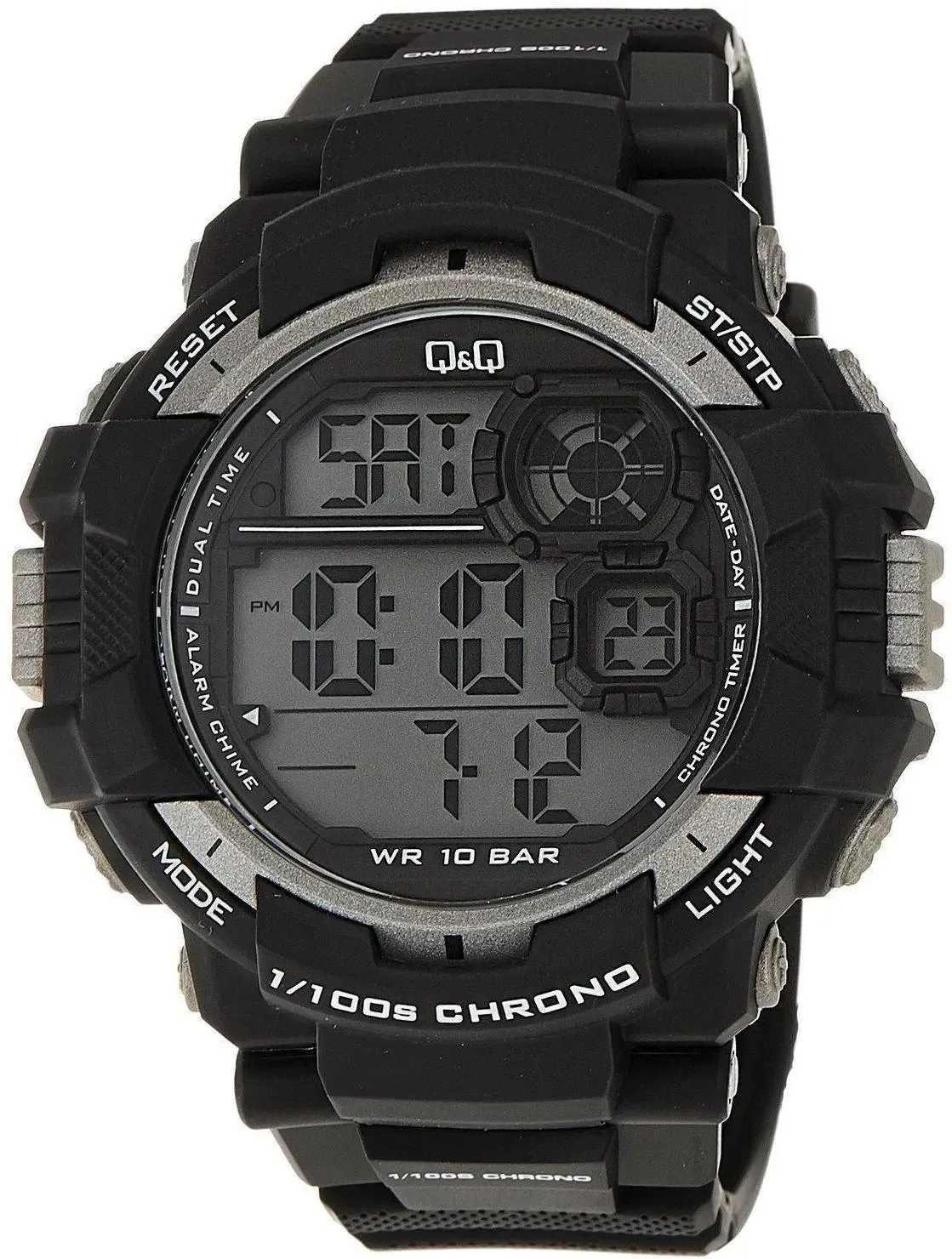 <b>Мужские наручные часы Q&Q Attractive M143J002Y.</b> Точный кварцевый механизм с цифровой индикацией. Полимерный корпус надежно защищает часы от механических повреждений. Светодиодная подсветка. На циферблате отображается текущее число, месяц и день недели. Функция хронографа. Полимерный ремешок. Натуральный полимерный материал является идеальным для изготовления ремешка благодаря своей чрезвычайной прочности и гибкости. Органическое стекло. Часы являются водонепроницаемыми до 10 Бар. Цвет корпуса: Черный. Цвет циферблата: Серый. Ширина (с заводной головкой): 45мм. Толщина: 14мм. Гарантия: 1 год.