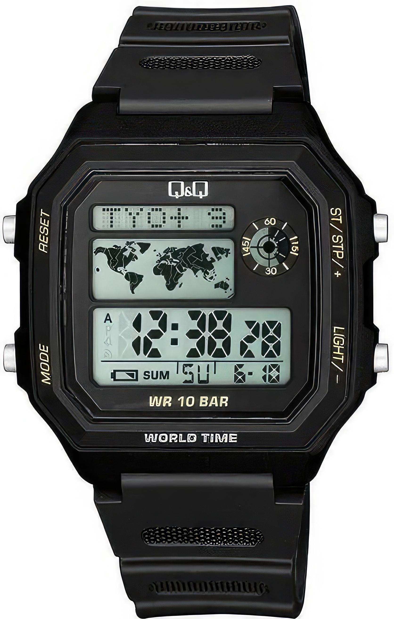 Мужские наручные часы Q&Q Attractive M196J002Y. Точный кварцевый механизм с цифровой индикацией. Полимерный корпус надежно защищает часы от механических повреждений. Светодиодная подсветка. На циферблате отображается текущее число, месяц и день недели. Функция хронографа. Полимерный ремешок. Натуральный полимерный материал является идеальным для изготовления ремешка благодаря своей чрезвычайной прочности и гибкости. Органическое стекло. Часы являются водонепроницаемыми до 10 Бар. Ширина (с заводной головкой): 42мм. Толщина: 13мм. Гарантия: 1 год.