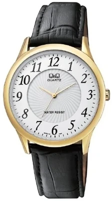 <b>Мужские наручные часы Q&Q Attractive Q948J104Y.</b> Точный кварцевый механизм с аналоговой индикацией. Корпус изготовлен из высококачественной часовой латуни с высокими антикоррозийными свойствами. Ремешок изготовлен из кожи. Прочное, устойчивое к царапинам минеральное стекло защищает часы от повреждений.Часы являются водонепроницаемыми до 3 Бар. Цвет корпуса: Желтое золото. Цвет циферблата: Белый. Ширина (с заводной головкой): 42мм. Толщина: 8мм. Гарантия: 1 год.