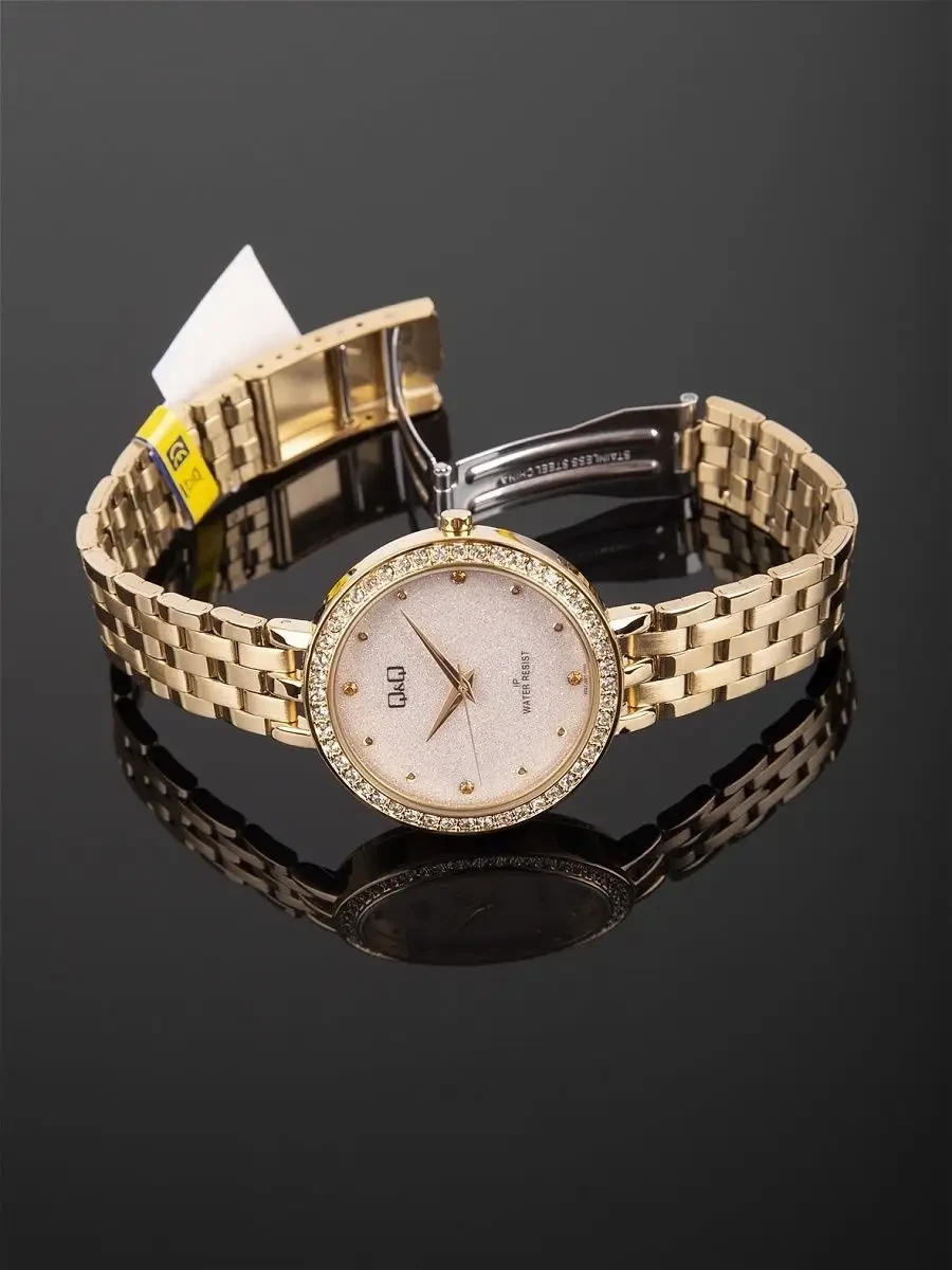 Женские наручные часы Q&Q Attractive QZ27J001Y. Точный кварцевый механизм с аналоговой индикацией. Корпус изготовлен из высококачественной часовой латуни с высокими антикоррозийными свойствами. Браслет из нержавеющей стали. Прочное, устойчивое к царапинам минеральное стекло защищает часы от повреждений.Часы являются водонепроницаемыми до 3 Бар. Цвет корпуса: Желтое золото. Цвет циферблата: Золотистый. Ширина (с заводной головкой): 36мм. Толщина: 8мм. Гарантия: 1 год.