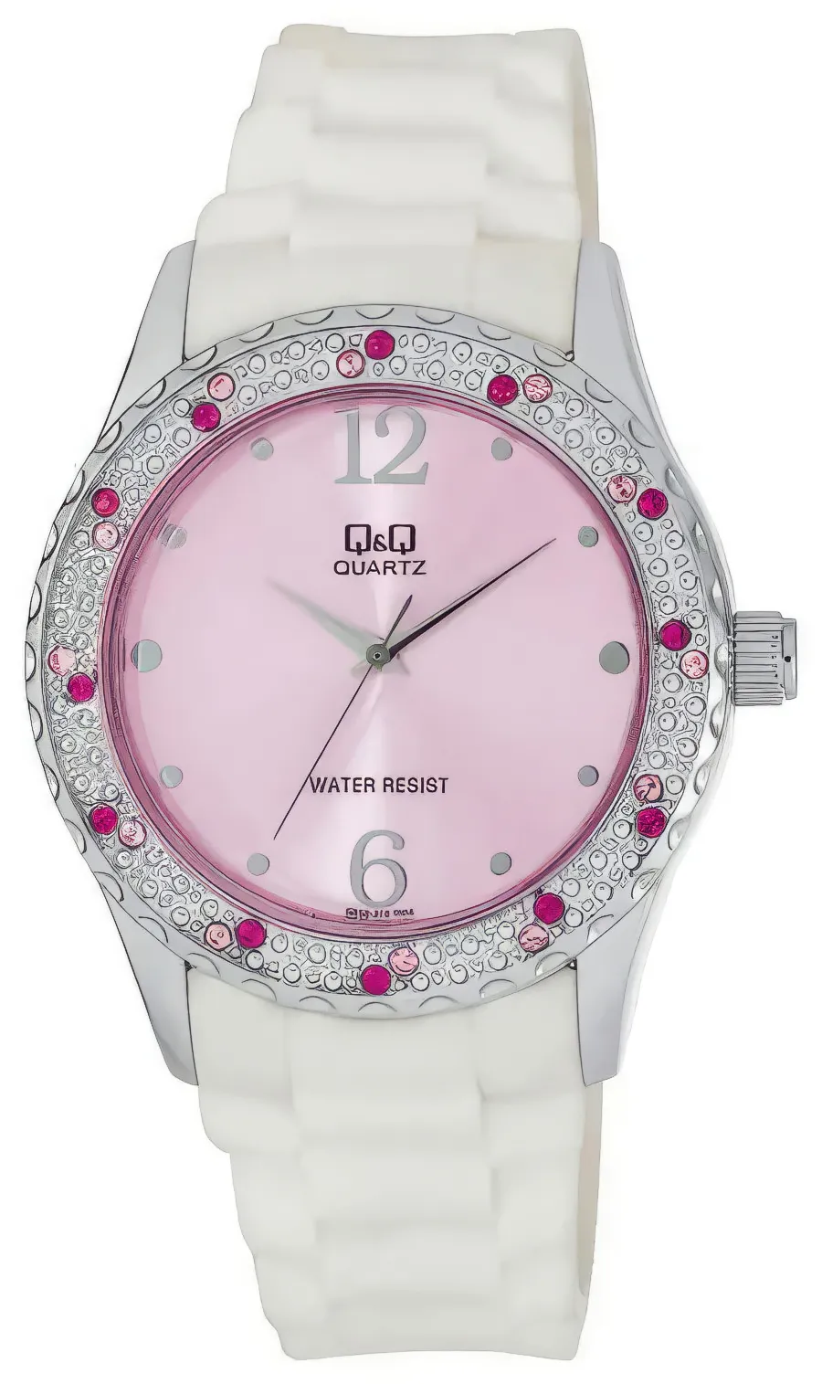 Женские наручные часы Q&Q Attractive Women Q833J312Y. Точный кварцевый механизм с аналоговой индикацией. Корпус изготовлен из высококачественной часовой латуни с высокими антикоррозийными свойствами. Ремешок изготовлен из каучука. Прочное, устойчивое к царапинам минеральное стекло защищает часы от повреждений.Часы являются водонепроницаемыми до 3 Бар. Цвет корпуса: Серебристый. Цвет циферблата: Розовый. Ширина (с заводной головкой): 38мм. Толщина: 9мм. Гарантия: 1 год.