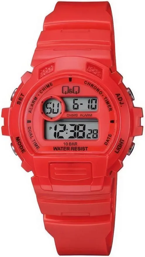 Электронные часы с точность хода не хуже -10 +15 сек./в месяц. • Ежедневный будильник со звуковым сигналом. • Секундомер. • Таймер обратного отсчета. • Автоматический календарь. • Электрическая подсветка - для освещения циферблата используется светодиод. • Минеральное стекло устойчивое к возникновению царапин. • Надёжный корпус из прочного и лёгкого пластика. • Красный каучуковый ремешок. • Водозащита до 10 АТМ. • Диаметр корпуса 41 мм, толщина 9 мм.