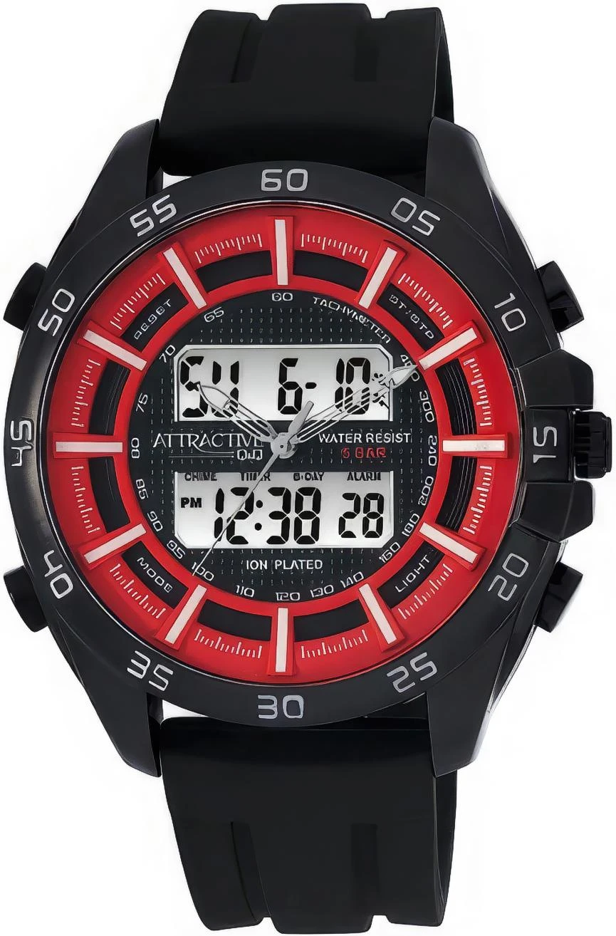 Мужские наручные часы Q&Q DE08J542Y. Точный кварцевый механизм с аналого-цифровой индикацией. Корпус изготовлен из высококачественной часовой латуни с высокими антикоррозийными свойствами. Светодиодная подсветка. На циферблате отображается текущее число, месяц и день недели. Полимерный ремешок. Натуральный полимерный материал является идеальным для изготовления ремешка благодаря своей чрезвычайной прочности и гибкости. Прочное, устойчивое к царапинам минеральное стекло защищает часы от повреждений.Часы являются водонепроницаемыми до 5 Бар. Цвет корпуса: Черный. Ширина (с заводной головкой): 50мм. Гарантия: 1 год.