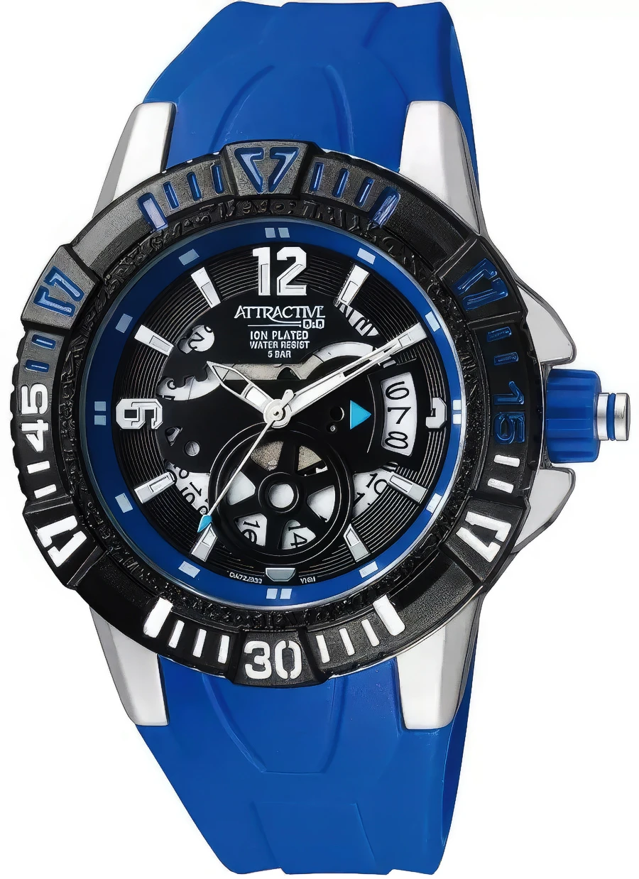 Точный кварцевый механизм. Центральная секундная стрелка. Окошко даты. • Точность хода не хуже -10 +15 сек./в месяц. • Светонакопительный состав на стрелках. • Минеральное стекло устойчивое к возникновению царапин. • Корпус из высококачественного стального сплава и пластика. • Синий каучуковый ремешок. • Водозащита до 5 АТМ. • Диаметр корпуса 45 мм, толщина 12 мм. Вес 55 гр.