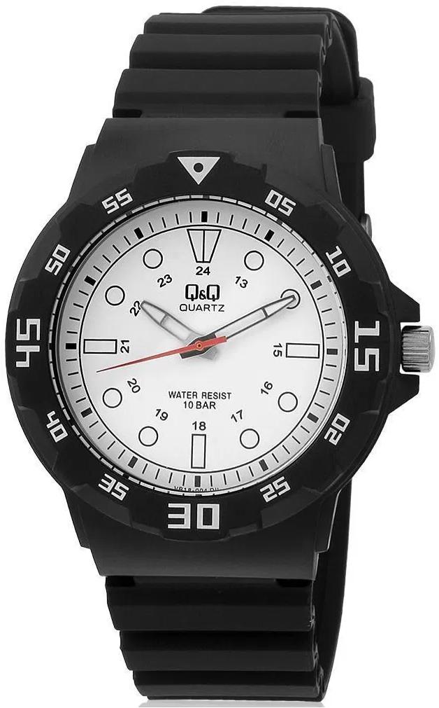 <b>Мужские наручные часы Q&Q VR18J004Y.</b> Точный кварцевый механизм с аналоговой индикацией. Полимерный корпус надежно защищает часы от механических повреждений. Полимерный ремешок. Натуральный полимерный материал является идеальным для изготовления ремешка благодаря своей чрезвычайной прочности и гибкости. Прочное, устойчивое к царапинам минеральное стекло защищает часы от повреждений.Часы являются водонепроницаемыми до 10 Бар. Цвет корпуса: Черный. Цвет циферблата: Белый. Ширина (с заводной головкой): 25мм. Гарантия: 1 год.