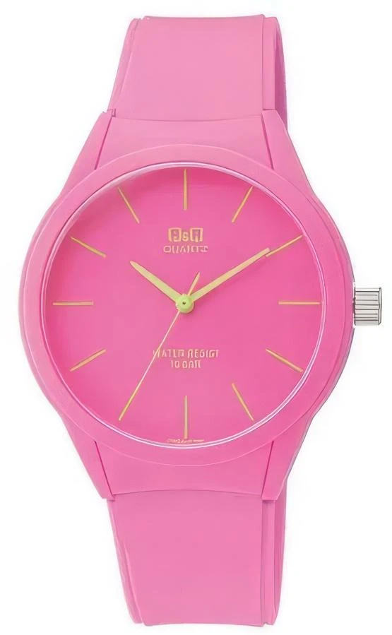 <b>Женские наручные часы Q&Q VR28J012Y.</b> Точный кварцевый механизм с аналоговой индикацией. Полимерный корпус надежно защищает часы от механических повреждений. Полимерный ремешок. Натуральный полимерный материал является идеальным для изготовления ремешка благодаря своей чрезвычайной прочности и гибкости. Органическое стекло. Часы являются водонепроницаемыми до 10 Бар. Цвет корпуса: Розовый. Цвет циферблата: Розовый. Ширина (с заводной головкой): 44мм. Толщина: 12мм. Гарантия: 1 год.