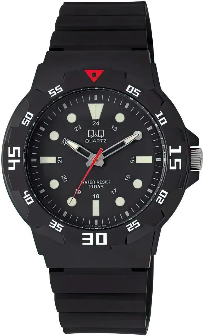 Мужские наручные часы Q&Q  VR18J002Y. Точный кварцевый механизм с аналоговой индикацией. Полимерный корпус надежно защищает часы от механических повреждений. Полимерный ремешок. Натуральный полимерный материал является идеальным для изготовления ремешка благодаря своей чрезвычайной прочности и гибкости. Прочное, устойчивое к царапинам минеральное стекло защищает часы от повреждений.Часы являются водонепроницаемыми до 10 Бар. Цвет корпуса: Черный. Цвет циферблата: Черный. Ширина (с заводной головкой): 25мм. Гарантия: 1 год.