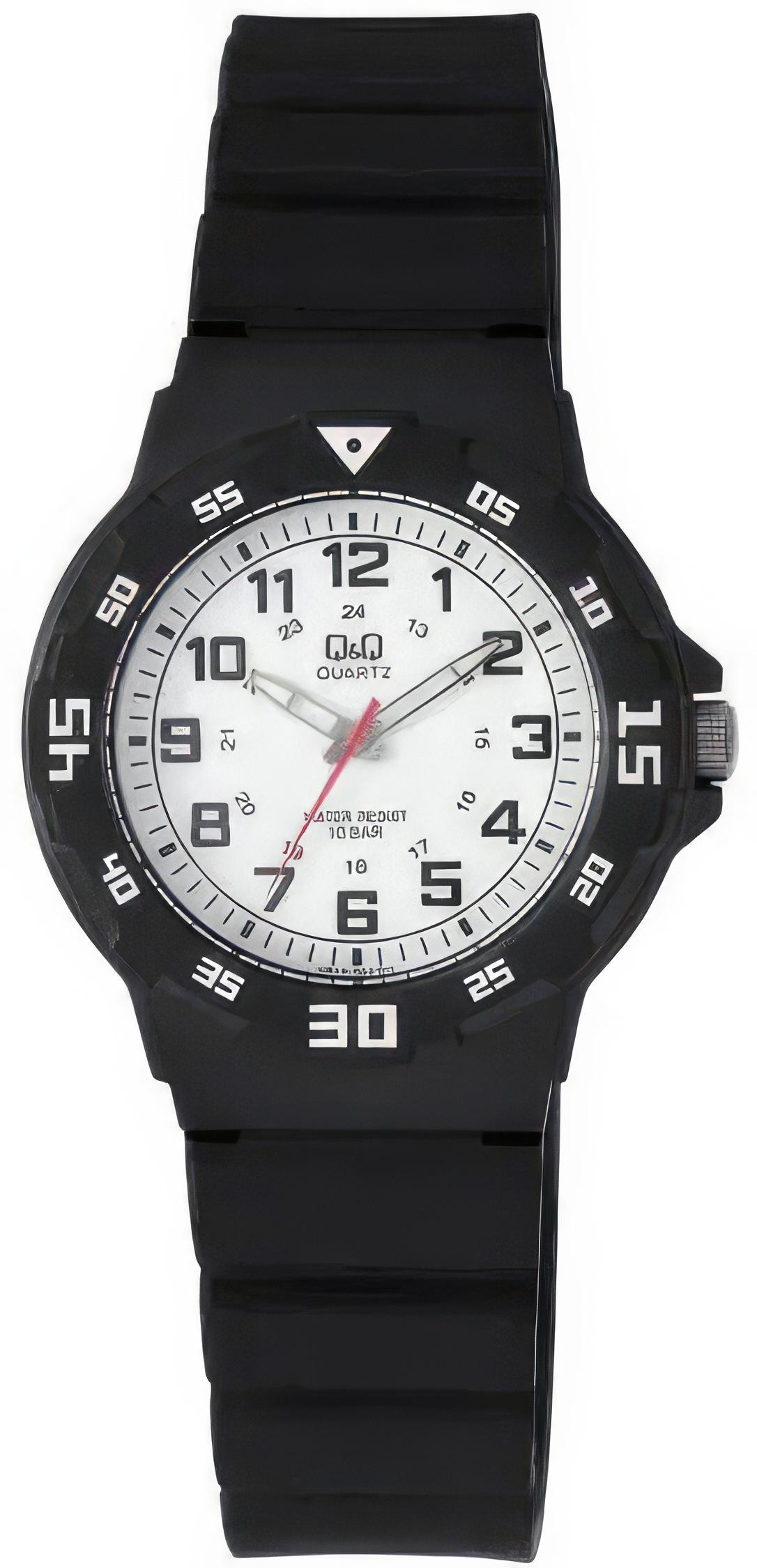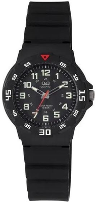 <b>Детские наручные часы Q&Q VR19J003Y.</b> Точный кварцевый механизм с аналоговой индикацией. Полимерный корпус надежно защищает часы от механических повреждений. Полимерный ремешок. Натуральный полимерный материал является идеальным для изготовления ремешка благодаря своей чрезвычайной прочности и гибкости. Прочное, устойчивое к царапинам минеральное стекло защищает часы от повреждений.Часы являются водонепроницаемыми до 10 Бар. Цвет корпуса: Черный. Цвет циферблата: Белый. Ширина (с заводной головкой): 25мм. Гарантия: 1 год.