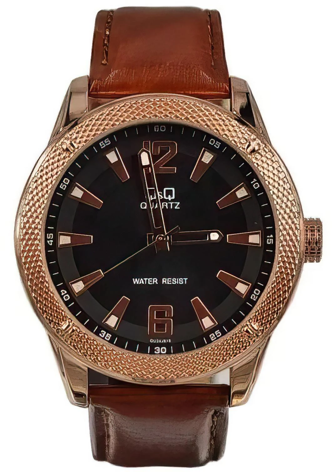<b>Мужские наручные часы Q&Q GU34J810Y.</b> Точный кварцевый механизм с аналоговой индикацией. Корпус изготовлен из высококачественной часовой латуни с высокими антикоррозийными свойствами. Ремешок изготовлен из кожи. Прочное, устойчивое к царапинам минеральное стекло защищает часы от повреждений.Часы являются водонепроницаемыми до 3 Бар. Цвет корпуса: Розовое золото. Цвет циферблата: Черный. Ширина (с заводной головкой): 42мм. Гарантия: 1 год.