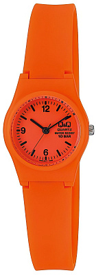<b>Детские наручные часы Q&Q VP47J017Y.</b> Точный кварцевый механизм с аналоговой индикацией. Полимерный корпус надежно защищает часы от механических повреждений. Полимерный ремешок. Натуральный полимерный материал является идеальным для изготовления ремешка благодаря своей чрезвычайной прочности и гибкости. Прочное, устойчивое к царапинам минеральное стекло защищает часы от повреждений.Часы являются водонепроницаемыми до 10 Бар. Цвет корпуса: Оранжевый. Цвет циферблата: Оранжевый. Ширина (с заводной головкой): 24мм. Толщина: 10мм. Гарантия: 1 год.
