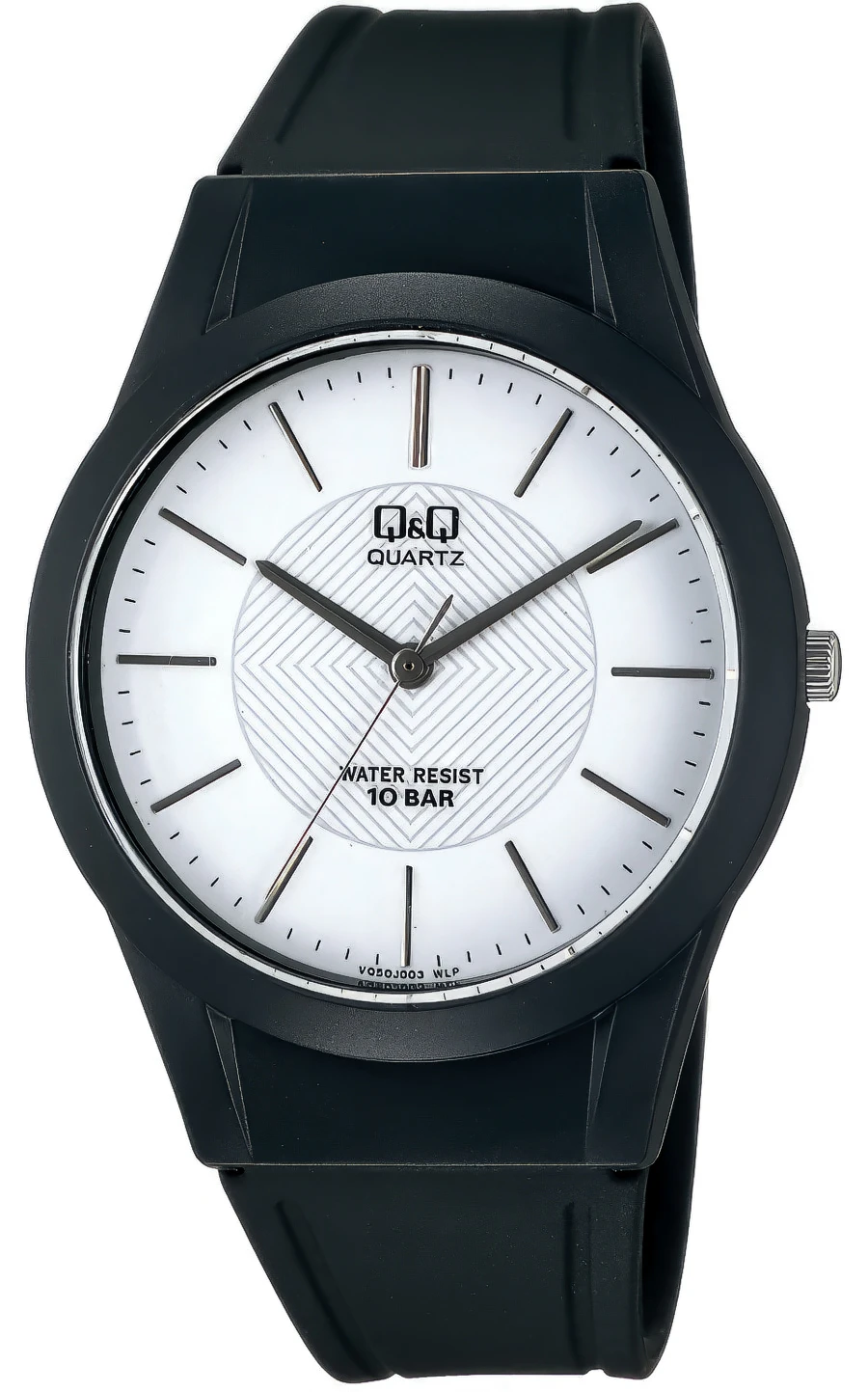 <b>Мужские наручные часы Q&Q VQ50J003Y.</b> Точный кварцевый механизм с аналоговой индикацией. Полимерный корпус надежно защищает часы от механических повреждений. Полимерный ремешок. Натуральный полимерный материал является идеальным для изготовления ремешка благодаря своей чрезвычайной прочности и гибкости. Прочное, устойчивое к царапинам минеральное стекло защищает часы от повреждений.Часы являются водонепроницаемыми до 10 Бар. Цвет корпуса: Черный. Цвет циферблата: Серебристый. Ширина (с заводной головкой): 38мм. Гарантия: 1 год.