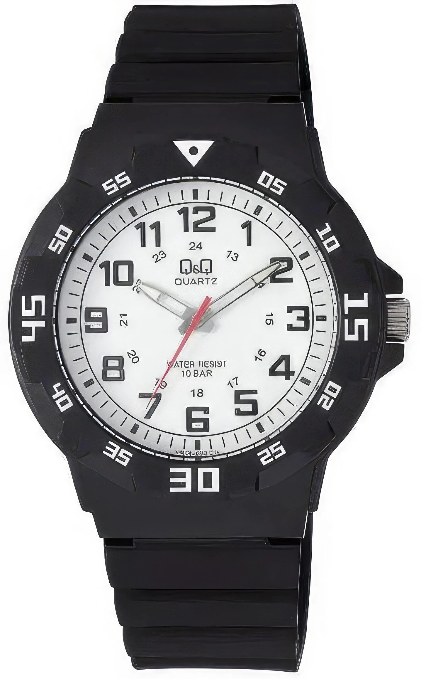 <b>Мужские наручные часы Q&Q VR18J003Y.</b> Точный кварцевый механизм с аналоговой индикацией. Полимерный корпус надежно защищает часы от механических повреждений. Полимерный ремешок. Натуральный полимерный материал является идеальным для изготовления ремешка благодаря своей чрезвычайной прочности и гибкости. Прочное, устойчивое к царапинам минеральное стекло защищает часы от повреждений.Часы являются водонепроницаемыми до 10 Бар. Цвет корпуса: Черный. Цвет циферблата: Белый. Ширина (с заводной головкой): 25мм. Гарантия: 1 год.
