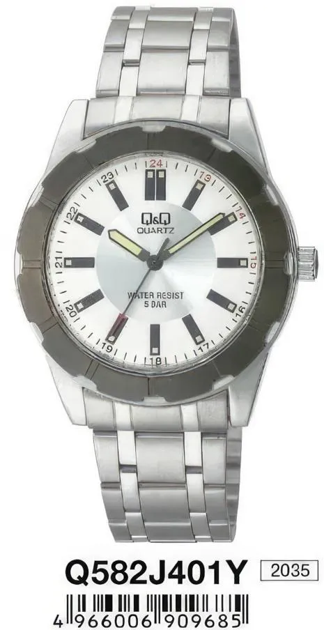 <b>Мужские наручные часы Q&Q Q582J401Y.</b> Точный кварцевый механизм с аналоговой индикацией. Корпус изготовлен из высококачественной часовой латуни с высокими антикоррозийными свойствами. Браслет из нержавеющей стали. Прочное, устойчивое к царапинам минеральное стекло защищает часы от повреждений.Часы являются водонепроницаемыми до 5 Бар. Цвет циферблата: Белый. Гарантия: 1 год.