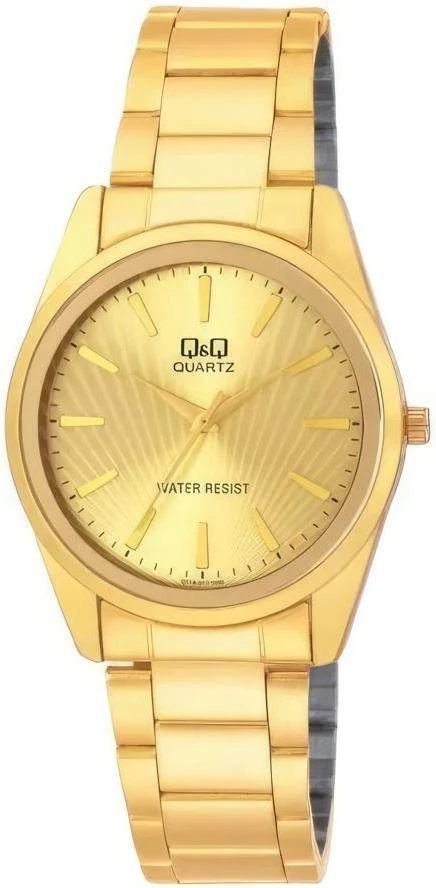Мужские наручные часы Q&Q Q718J010Y. Точный кварцевый механизм с аналоговой индикацией. Корпус изготовлен из высококачественной часовой латуни с высокими антикоррозийными свойствами. Браслет из нержавеющей стали. Прочное, устойчивое к царапинам минеральное стекло защищает часы от повреждений.Часы являются водонепроницаемыми до 3 Бар. Цвет корпуса: Желтое золото. Цвет циферблата: Золотистый. Гарантия: 1 год.