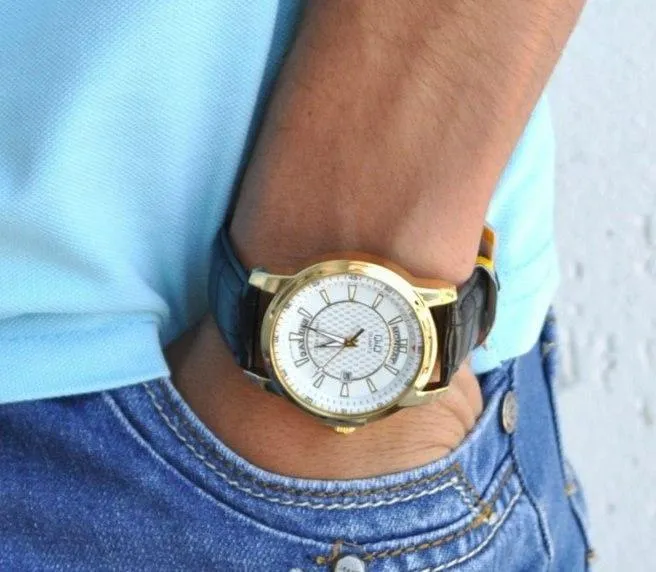 Мужские наручные часы Q&Q A184J101Y. Точный кварцевый механизм с аналоговой индикацией. Корпус изготовлен из высококачественной нержавеющей стали 316L с высокими антикоррозийными свойствами. На стрелки и отметки нанесен светонакопительный состав, благодаря этому считывать информацию с циферблата возможно и в темноте. На циферблате отображается текущее число месяца и день недели. Ремешок изготовлен из кожи. Прочное, устойчивое к царапинам минеральное стекло защищает часы от повреждений. Часы являются водонепроницаемыми до 3 Бар. Цвет корпуса: Желтое золото. Цвет циферблата: Белый. Ширина (с заводной головкой): 40мм. Толщина: 10мм. Гарантия: 1 год.
