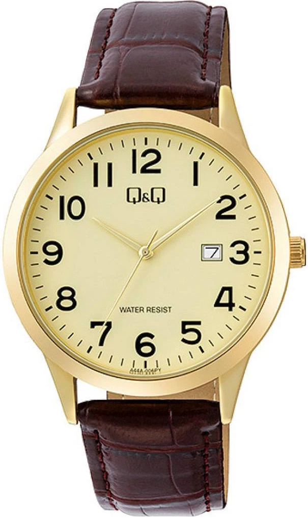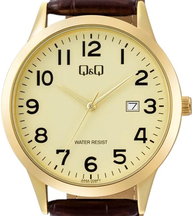 Мужские наручные часы Q&Q Casual A44AJ006Y. Точный кварцевый механизм с аналоговой индикацией. В отличие от механических часов, не требуют завода и работают от батареи, показывая отклонение всего несколько секунд в месяц. Ремешок изготовлен из кожи. Гибкость такого ремешка позволяет точно регулировать посадку часов на руке. Корпус изготовлен из высококачественной часовой латуни с высокими антикоррозийными свойствами. Прочное, устойчивое к царапинам минеральное стекло защищает часы от повреждений. Часы являются водонепроницаемыми до 3 Бар. Цвет корпуса: Желтое золото. Цвет циферблата: Золотистый. Высота (с ушками): 40 мм. Толщина: 9.5 мм. Гарантия: 1 год.