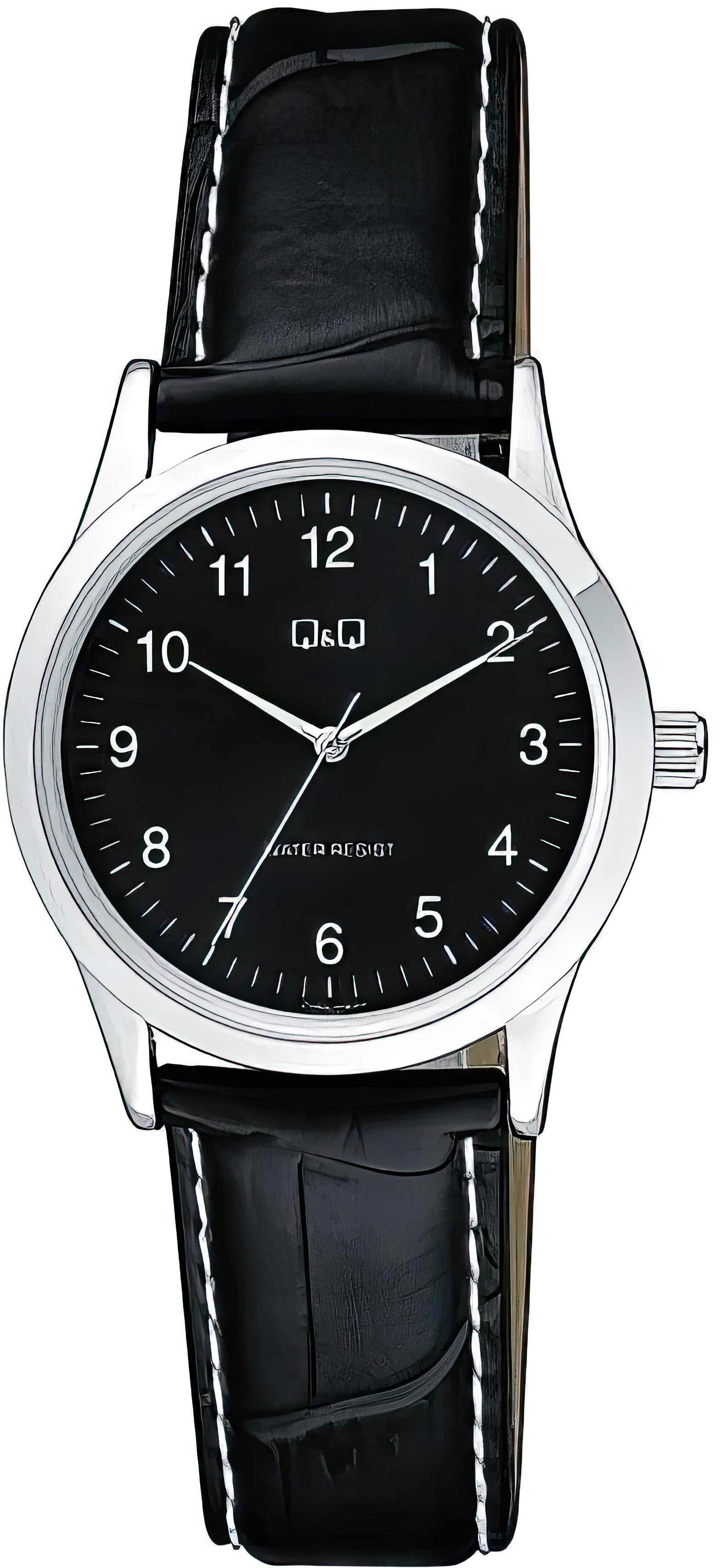 Женские наручные часы Q&Q Casual C09AJ018Y. Точный кварцевый механизм с аналоговой индикацией. Ремешок изготовлен из кожи. Латунный браслет. Прочное, устойчивое к царапинам минеральное стекло защищает часы от повреждений. Часы являются водонепроницаемыми до 3 Бар. Цвет циферблата: Серебристый. Цвет корпуса: Черный. Толщина: 8 мм. Гарантия: 1 год.