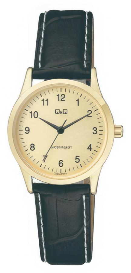 Женские наручные часы Q&Q Casual C09AJ019Y. Точный кварцевый механизм с аналоговой индикацией. Ремешок изготовлен из кожи. Браслет из нержавеющей стали. Прочное, устойчивое к царапинам минеральное стекло защищает часы от повреждений. Часы являются водонепроницаемыми до 3 Бар. Цвет циферблата: Желтое золото. Цвет корпуса: Золотистый. Толщина: 8 мм. Гарантия: 1 год.